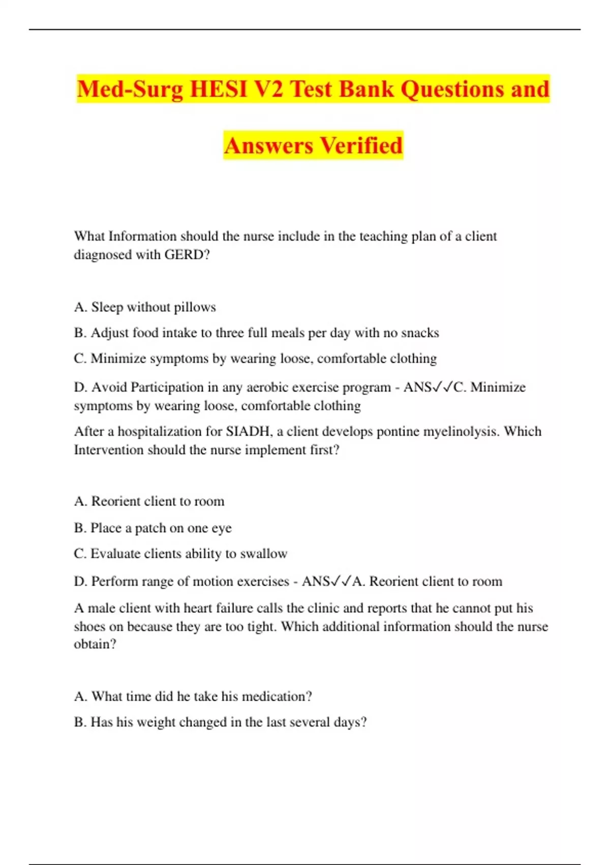Med-Surg HESI V2 Test Bank Questions and Answers Verified What Information should the nurse include in the teaching plan of a client diagnosed with GERD? A. Sleep without pillows B. Adjust food intake to three full meals per day with no snacks C. Minimize symptoms by wearing loose, comfortable clothing D. Avoid Participation in any aerobic exercise program - ANSC. Minimize symptoms by wearing loose, comfortable clothing After a hospitalization for SIADH, a client develops pontine myelinolysis. Which Intervention should the nurse implement first? A. Reorient client to room B. Place a patch on one eye C. Evaluate clients ability to swallow D. Perform range of motion exercises - ANSA. Reorient client to room A male client with heart failure calls the clinic and reports that he cannot put his shoes on because they are too tight. Which additional information should the nurse obtain? A. What time did he take his medication? B. Has his weight changed in the last several days? C. Is he still able to tighten his belt buckle? D. How many hours did he sleep last night? - ANSB. Has his weight changed over the last several days? An older adult woman with a long hist