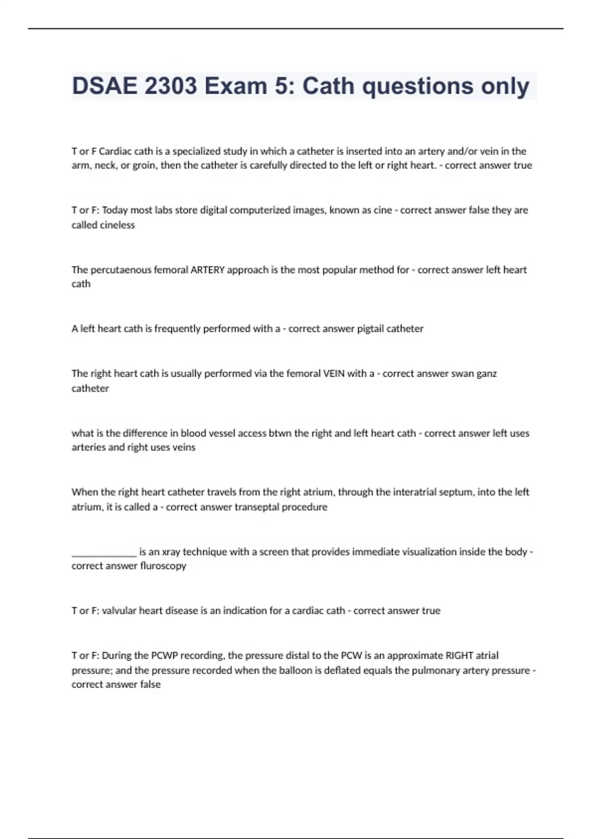 DSAE 2303 Exam 5 Cath questions only with complete solution 2023/2024 T or F Cardiac cath is a specialized study in which a catheter is inserted into an artery and/or vein in the arm, neck, or groin, then the catheter is carefully directed to the left or right heart. - correct answer true T or F: Today most labs store digital computerized images, known as cine - correct answer false they are called cineless The percutaenous femoral ARTERY approach is the most popular method for - correct answer left heart cath A left heart cath is frequently performed with a - correct answer pigtail catheter