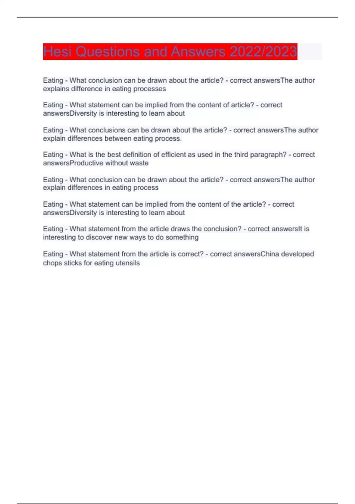 Hesi Questions and Answers 2023/2024 verified to passEating - What conclusion can be drawn about the article? - correct answersThe author explains difference in eating processes Eating - What statement can be implied from the content of article? - correct answersDiversity is interesting to learn about Eating - What conclusions can be drawn about the article? - correct answersThe author explain differences between eating process. Eating - What is the best definition of efficient as used in the third paragraph? - correct answersProductive without waste Eating - What conclusion can be drawn about the article? - correct answersThe author explain differences in eating process