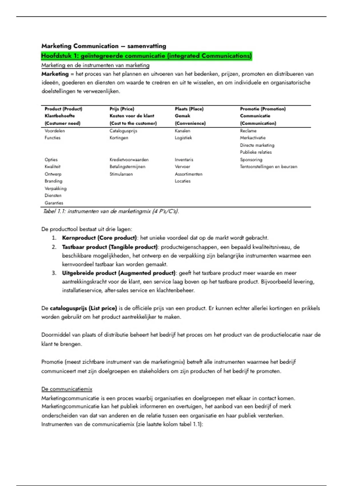 Samenvatting van Marketing Communication in het Nederlands met de begrippen in het Engels. Ideaal voor als je de stof in het Nederlands wilt leren voor een engels talig tentamen!