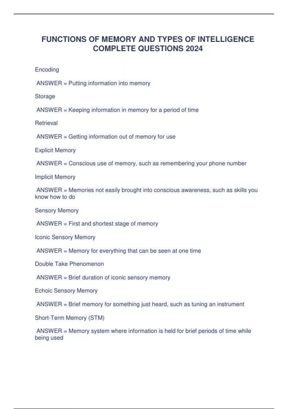 FUNCTIONS OF MEMORY AND TYPES OF INTELLIGENCE COMPLETE QUESTIONS AND ANSWERS 2024