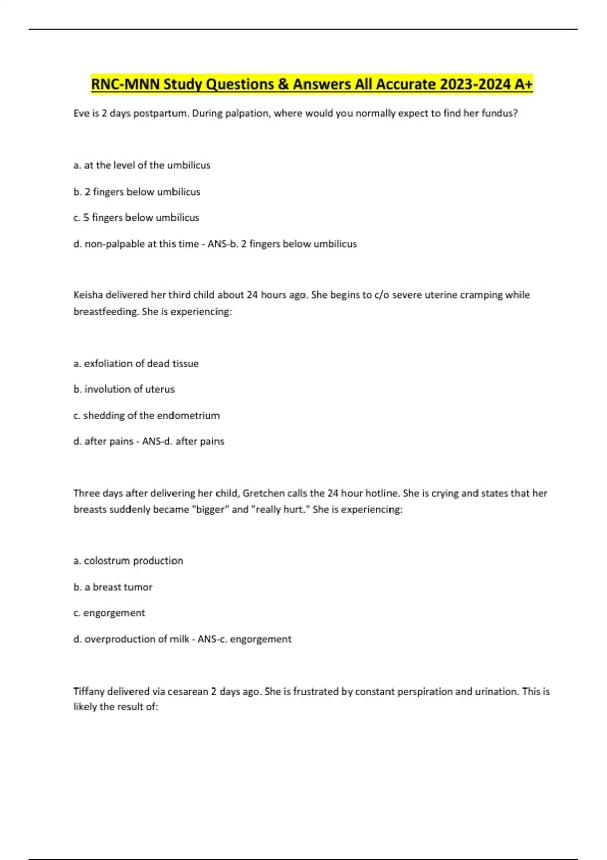 RNC-MNN Study Questions & Answers All Accurate A+ Eve is 2 days postpartum. During palpation, where would you normally expect to find her fundus? a. at the level of the umbilicus b. 2 fingers below umbilicus c. 5 fingers below umbilicus d. non-palpable at this time - ANS-b. 2 fingers below umbilicus Keisha delivered her third child about 24 hours ago. She begins to c/o severe uterine cramping while breastfeeding. She is experiencing: a. exfoliation of dead tissue b. involution of uterus c. shedding of the endometrium d. after pains - ANS-d. after pains Three days after delivering her child, Gretchen calls the 24 hour hotline. She is crying and states that her breasts suddenly became "bigger" and "really hurt." She is experiencing: a. colostrum production b. a breast tumor c. engorgement d. overproduction of milk - ANS-c. engorgement Tiffany delivered via cesarean 2 days ago. She is frustrated by constant perspiration and urination. This is likely the result of: a. changes in urine pH and a possible UTI b. drinking too much fluid in the early postpartum period c. the body's removal of fluids accumulated during pregnancy d. receiving excessive amounts of IV fluids during labor - ANS-c. the body's removal of fluids accumulated during pregnancy While assessing Sierra, a 32yo mother of 3, you notice uterine bleeding and find that her uterus is displayed upward and to the right. This is probably cause by: Continues...