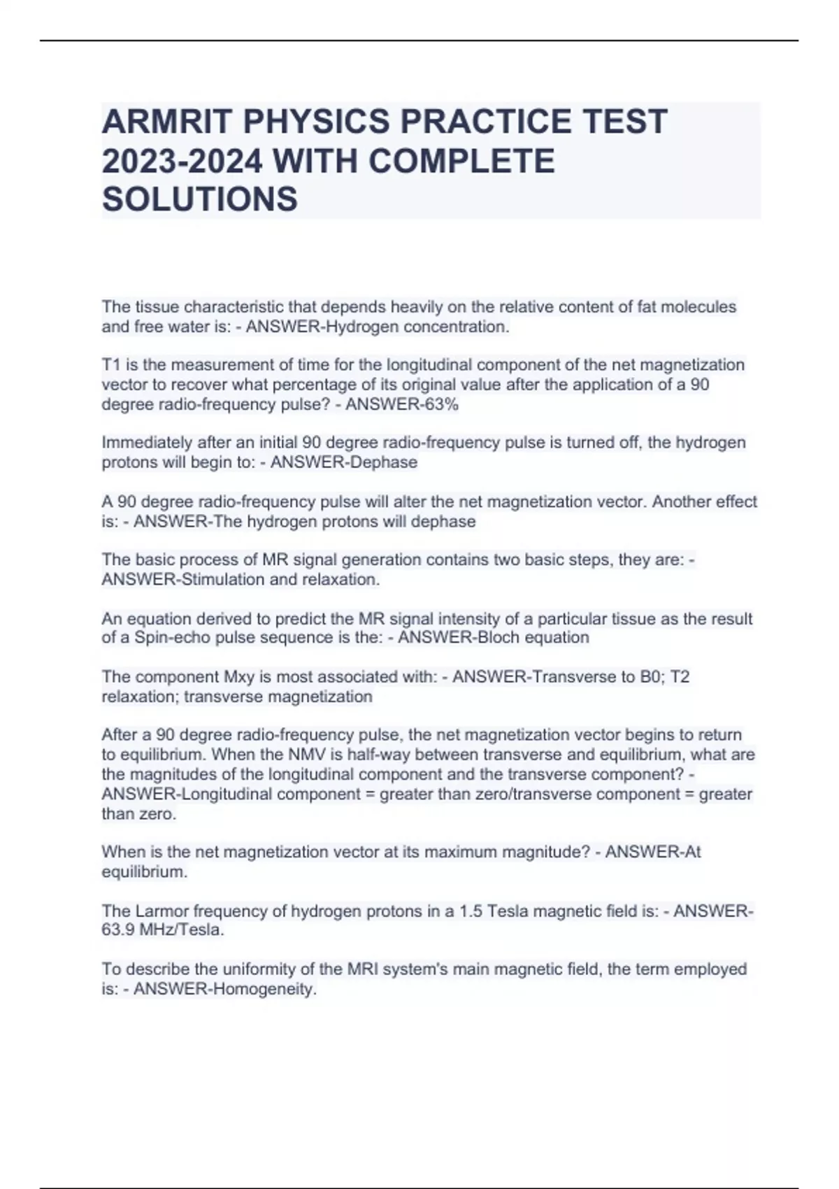 ARMRIT PHYSICS PRACTICE TEST WITH COMPLETE SOLUTIONS ARMRIT PHYSICS PRACTICE TEST WITH COMPLETE SOLUTIONS ARMRIT PHYSICS PRACTICE TEST WITH COMPLETE SOLUTIONS The tissue characteristic that depends heavily on the relative content of fat molecules and free water is: - ANSWER-Hydrogen concentration. T1 is the measurement of time for the longitudinal component of the net magnetization vector to recover what percentage of its original value after the application of a 90 degree radio-frequency pulse? - ANSWER-63% Immediately after an initial 90 degree radio-frequency pulse is turned off, the hydrogen protons will begin to: - ANSWER-Dephase A 90 degree radio-frequency pulse will alter the net magnetization vector. Another effect is: - ANSWER-The hydrogen protons will dephase