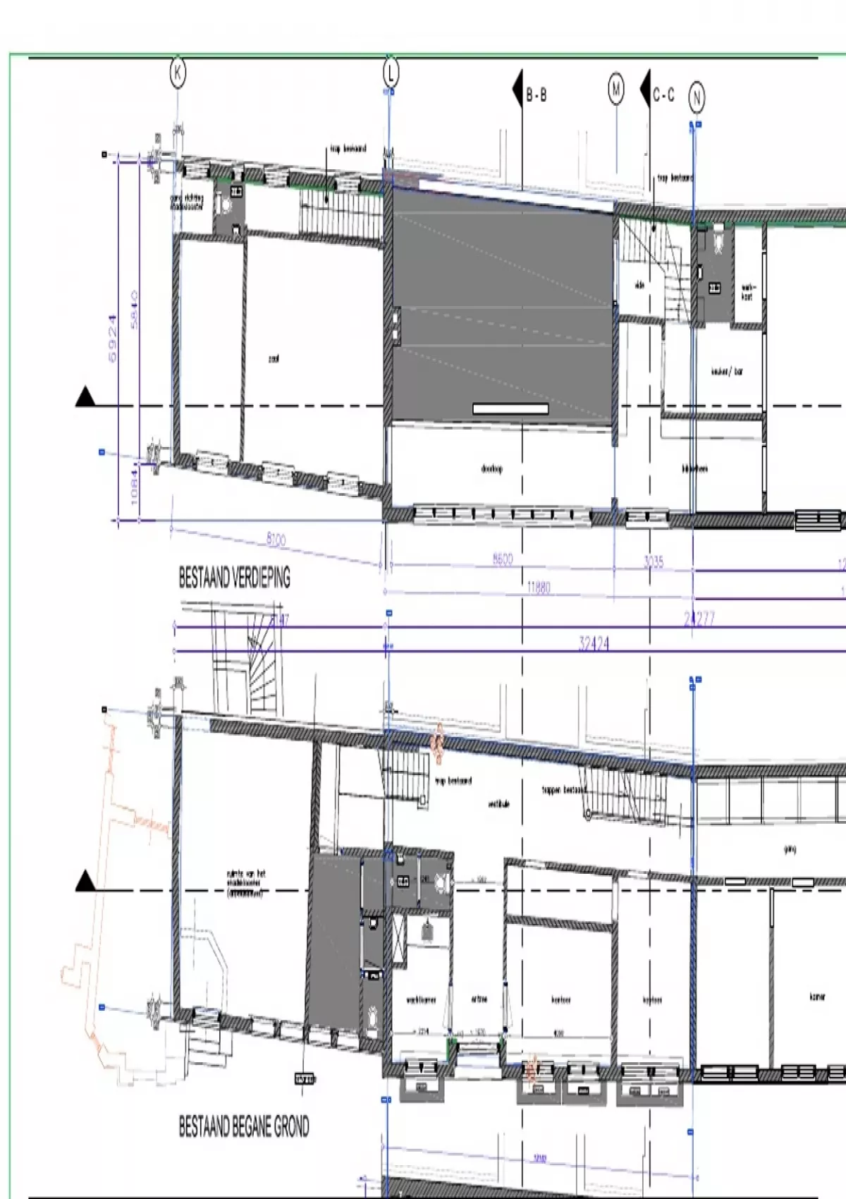 Bestaande situatie plattegronden, aanzichten en doorsneden