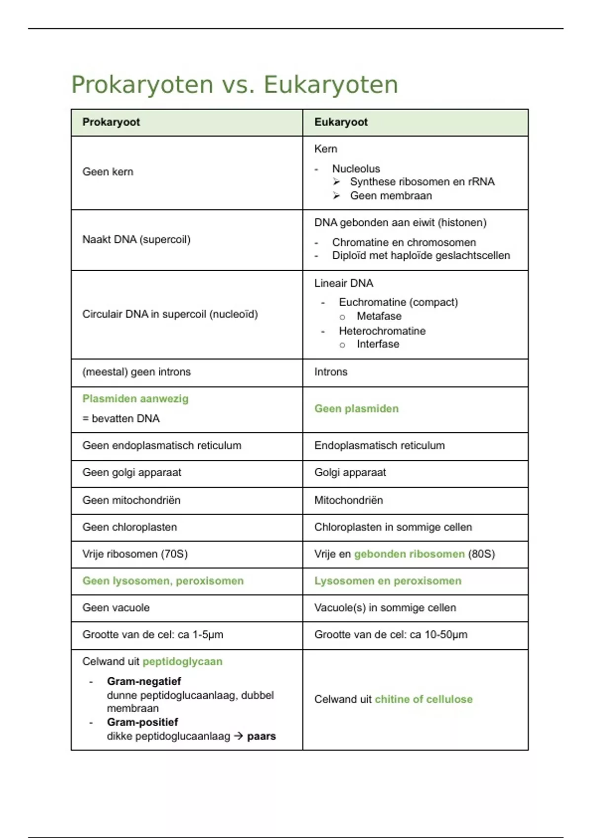 Samenvatting volledig overzicht verschillen prokaryoten en eukaryoten