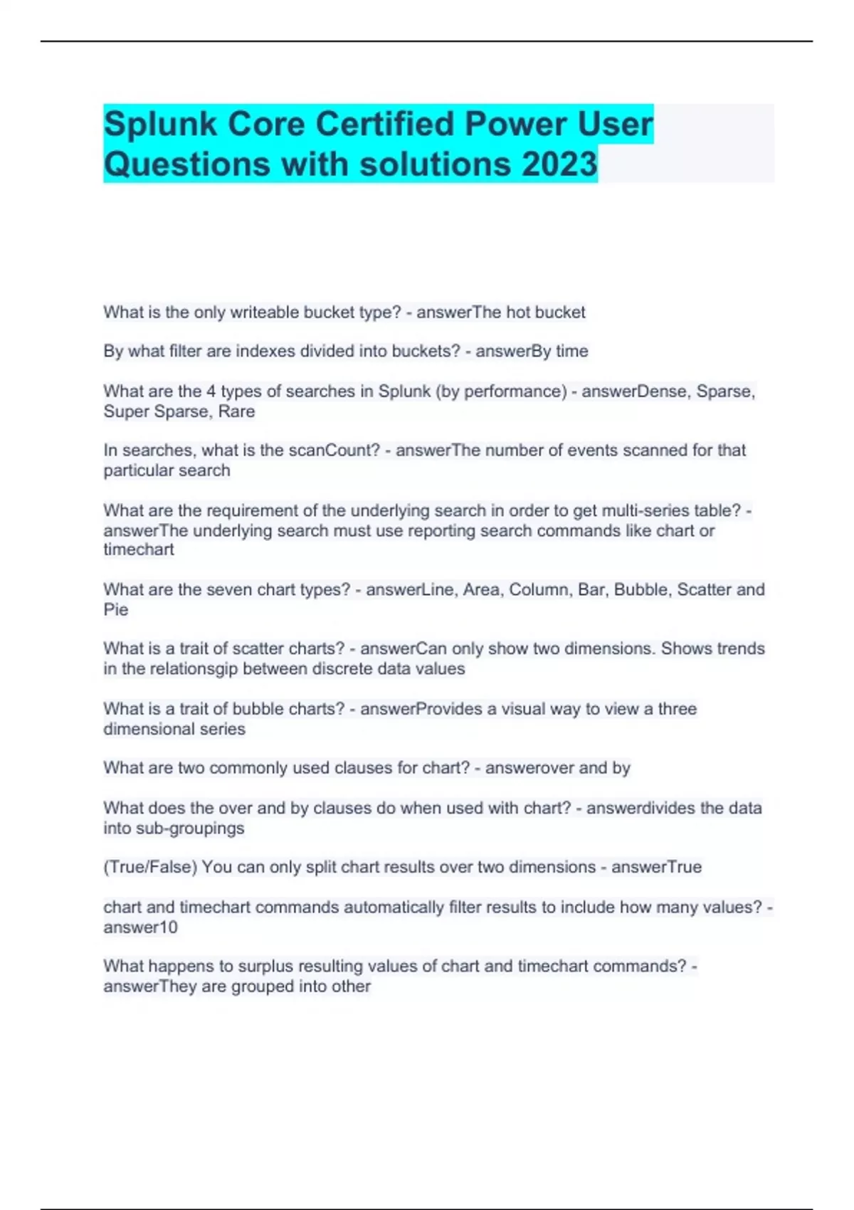 Splunk Core Certified Power User Questions with solutions 2023 What is the only writeable bucket type? The hot bucket By what filter are indexes divided into buckets? By time Brainpower Read More Previous Play Next Rewind 10 seconds Move forward 10 seconds Unmute 0:04 / 0:15 Full screen What are the 4 types of searches in Splunk (by performance) Dense, Sparse, Super Sparse, Rare In searches, what is the scanCount? The number of events scanned for that particular search What are the requirement of the underlying search in order to get multi-series table? The underlying search must use reporting search commands like chart or timechart What are the seven chart types? Line, Area, Column, Bar, Bubble, Scatter and Pie What is a trait of scatter charts? Can only show two dimensions. Shows trends in the relationsgip between discrete data values What is a trait of bubble charts? Provides a visual way to view a three dimensional series What are two commonly used clauses for chart? over and by What does the over and by clauses do when used with chart? divides the data into sub-groupings (True/False) You can only split chart results over two dimensions True chart and timechart commands automatically filter results to include how many values? 10 What happens to surplus resulting values of chart and timechart commands? They are grouped into other (True/False) Null values are not shown by default by chart and timechart False What is always the value on the x-axis for timechart? _time (True/False) Functions and arguments used with stats and chart can not be used with timechart False (True/False) As with chart, it is possible to split timechart by two fields False. It is only possible to split by one field What is the argument for adjusting sampling interval of timechart? span What does the trendline command do? allows you to overlay a computed moving average on a chart What is the syntax of the trendline command? trendline trendtypeperiod(field) [AS newfield] What command can be used to look up and add location information to an event? iploaction What information does the iplocation command include? city, country, region, latitude and longitude What is the data-requirement for the geostats command? Data must include latitude and longitude values These arguments are used to control column counts when using the geostats command gloabllimit and locallimit This command is used to compute statisticalm functions and render a cluster map geostats What command can be used to show relative metrics for predefined geographic regions? geom (True/False) A sparkline is an inline chart, that can be added to timechart True (True/False) Automatically totaling of every columns can be done by using the Format option True