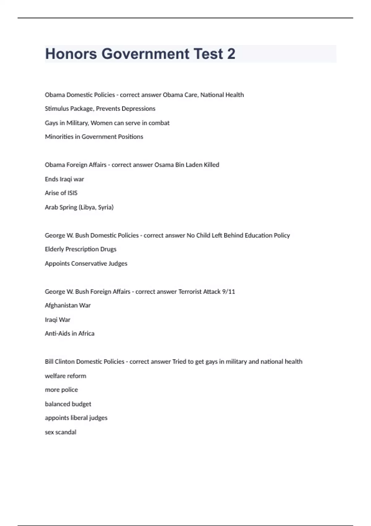 Honors Government Test 2 Questions with complete solution 2023/2024 Obama Domestic Policies - correct answer Obama Care, National Health Stimulus Package, Prevents Depressions Gays in Military, Women can serve in combat Minorities in Government Positions Obama Foreign Affairs - correct answer Osama Bin Laden Killed Ends Iraqi war