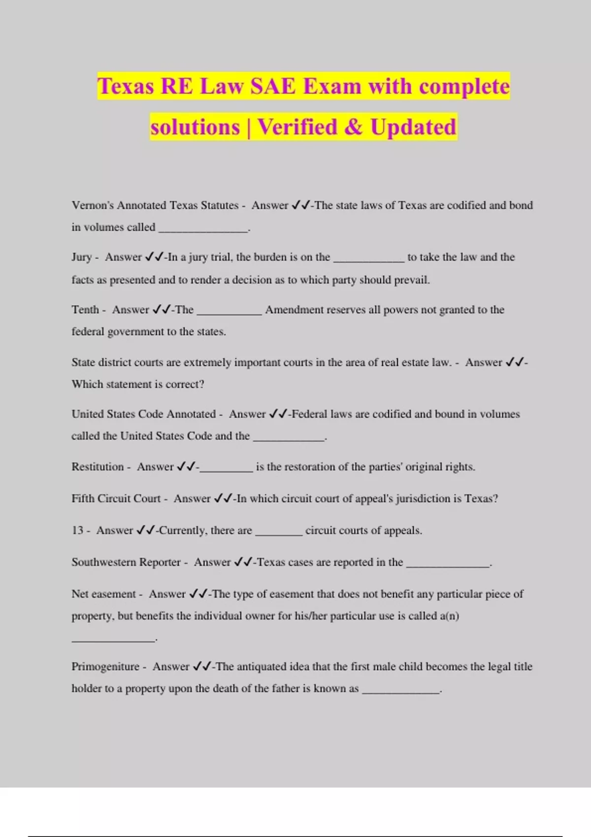 Texas RE Law SAE Exam with complete solutions | Verified & Updated Vernon's Annotated Texas Statutes - Answer ️️ -The state laws of Texas are codified and bond in volumes called _______________. Jury - Answer ️️ -In a jury trial, the burden is on the ____________ to take the law and the facts as presented and to render a decision as to which party should prevail. Tenth - Answer ️️ -The ___________ Amendment reserves all powers not granted to the federal government to the states. State district courts are extremely important courts in the area of real estate law. - Answer ️️ - Which statement is correct? United States Code Annotated - Answer ️️ -Federal laws are codified and bound in volumes called the United States Code and the ____________. Restitution - Answer ️️ -_________ is the restoration of the parties' original rights. Fifth Circuit Court - Answer ️️ -In which circuit court of appeal's jurisdiction is Texas? 13 - Answer ️️ -Currently, there are ________ circuit courts of appeals. Southwestern Reporter - Answer ️️ -Texas cases are reported in the ______________. Net easement - Answer ️️ -The type of easement that does not benefit any particular piece of property, but benefits the individual owner for his/her particular use is called a(n) ______________. Primogeniture - Answer ️️ -The antiquated idea that the first male child becomes the legal title holder to a property upon the death of the father is known as _____________.