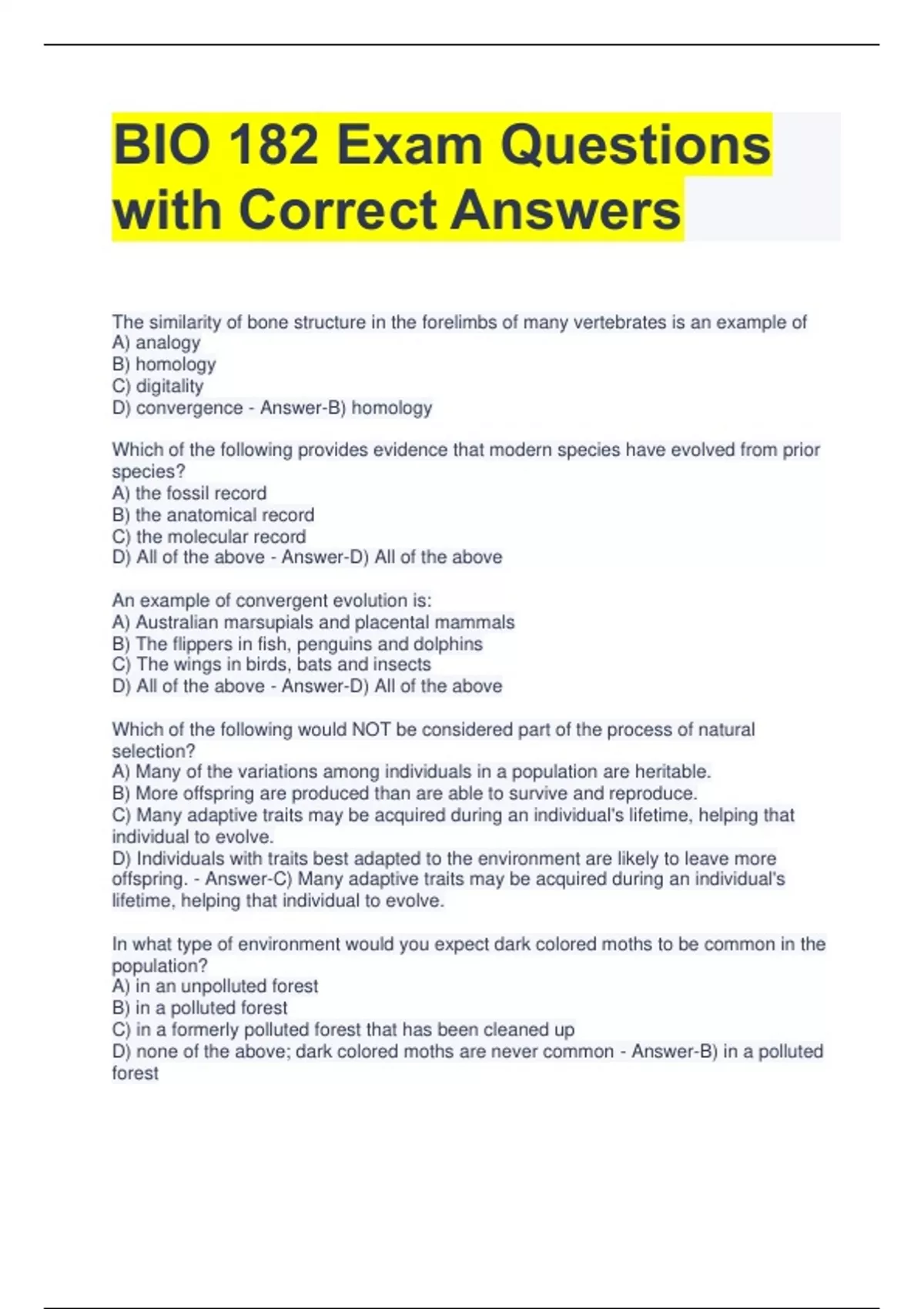 BIO 182 Exam Questions with Correct Answers The similarity of bone structure in the forelimbs of many vertebrates is an example of A) analogy B) homology C) digitality D) convergence - Answer-B) homology Which of the following provides evidence that modern species have evolved from prior species? A) the fossil record B) the anatomical record C) the molecular record D) All of the above - Answer-D) All of the above An example of convergent evolution is: A) Australian marsupials and placental mammals B) The flippers in fish, penguins and dolphins C) The wings in birds, bats and insects D) All of the above - Answer-D) All of the above Which of the following would NOT be considered part of the process of natural selection? A) Many of the variations among individuals in a population are heritable. B) More offspring are produced than are able to survive and reproduce. C) Many adaptive traits may be acquired during an individual's lifetime, helping that individual to evolve. D) Individuals with traits best adapted to the environment are likely to leave more offspring. - Answer-C) Many adaptive traits may be acquired during an individual's lifetime, helping that individual to evolve. In what type of environment would you expect dark colored moths to be common in the population? A) in an unpolluted forest B) in a polluted forest C) in a formerly polluted forest that has been cleaned up D) none of the above; dark colored moths are never common - Answer-B) in a polluted forest If pollution is cleaned up, what should happen to the moth population living in the woods? A) color patterns shouldn't change B) individual dark-colored moths should change to light-colored C) individual light-colored moths should change to dark-colored D) dark-colored moths should become more common in the population E) light-colored moths should become more common in the population - Answer-E) light-colored moths should become more common in the population Human-caused changes in the environment can affect natural selection. A) True B) False - Answer-A) True Which of the following is an example of artificial selection? A) different breeds of dogs B) antibiotic resistant bacteria C) dark peppered moths in polluted areas D) All of the above - Answer-A) different breeds of dogs The remnants of pelvic and leg bones in a snake A) are vestigial structures B) are homologous structures C) resulted from artificial selection D) none of the above - Answer-A) are vestigial structures Which embryos have gill slits and a tail in the early stages of development? A) Fish B) Frog C) Bird D) Human E) All of the above - Answer-E) All of the above Which statement relates to the evolution of disease-causing bacteria like TB? A) If antibiotics aren't taken as prescribed, some bacteria can survive. B) Bacteria evolve through the process of natural selection. C) When antibiotics are widely used, bacteria with genes that make them resistant to antibiotics increase in the population over time. D) All of the above are true - Answer-D) All of the above are true Which of the following ideas is commong to both Darwin's and Lamarck's theories of evolution? A) adaptation results from differential reproductive success B) evolution drives organisms to greater and greater complexity C) evolutionary adaptation results from interactions between organisms and their environments D) adaptation results from the use and disuse of anatomical structures - Answer-C) evolutionary adaptation results from interactions between organisms and their environments Using the molecular record to determine evolutionary relationships is based on the assumption that A) DNA sequences do not change over time B) DNA sequences change over time D) evolutionary changes occur in phenotypes (physical appearances) but not in genotypes (based on DNA). E) all mutations are harmful - Answer-B) DNA sequences change over time Which of the following statements related to natural selection is true? A) Variations among individuals in a population are not heritable. B) All offspring are equally likely to survive and reproduce. C) Many adaptive traits may be acquired during an individual's lifetime, helping that individual to evolve. D) Individuals with traits best adapted to the environment are likely to leave more offspring. E) All of the above - Answer-D) Individuals with traits best adapted to the environment are likely to leave more offspring. A theory in scientific terms is: A) just a guess B) a concept widely supported by experimental evidence C) a proposed answer to a question which will be supported or rejected by experimental evidence. - Answer-B) a concept widely supported by experimental evidence After World War II, DDT was regularly used to control insect pest populations. The use of DDT kept the numbers of malaria-carrying mosquitoes low for a while, but resistant mosquitoes began to appear quite quickly. Currently, most mosquito populations worldwide are DDT resistant. This is an example of: A) artificial selection B) mutation C) evolution - Answer-C) evolution Which of the following statements is false? A) The direction of natural selection can change B) Natural selection is a process without a planned outcome C) A phenotype that is beneficial in one environment, may be detrimental in another D) Natural selection operates at the level of individuals - Answer-D) Natural selection operates at the level of individuals