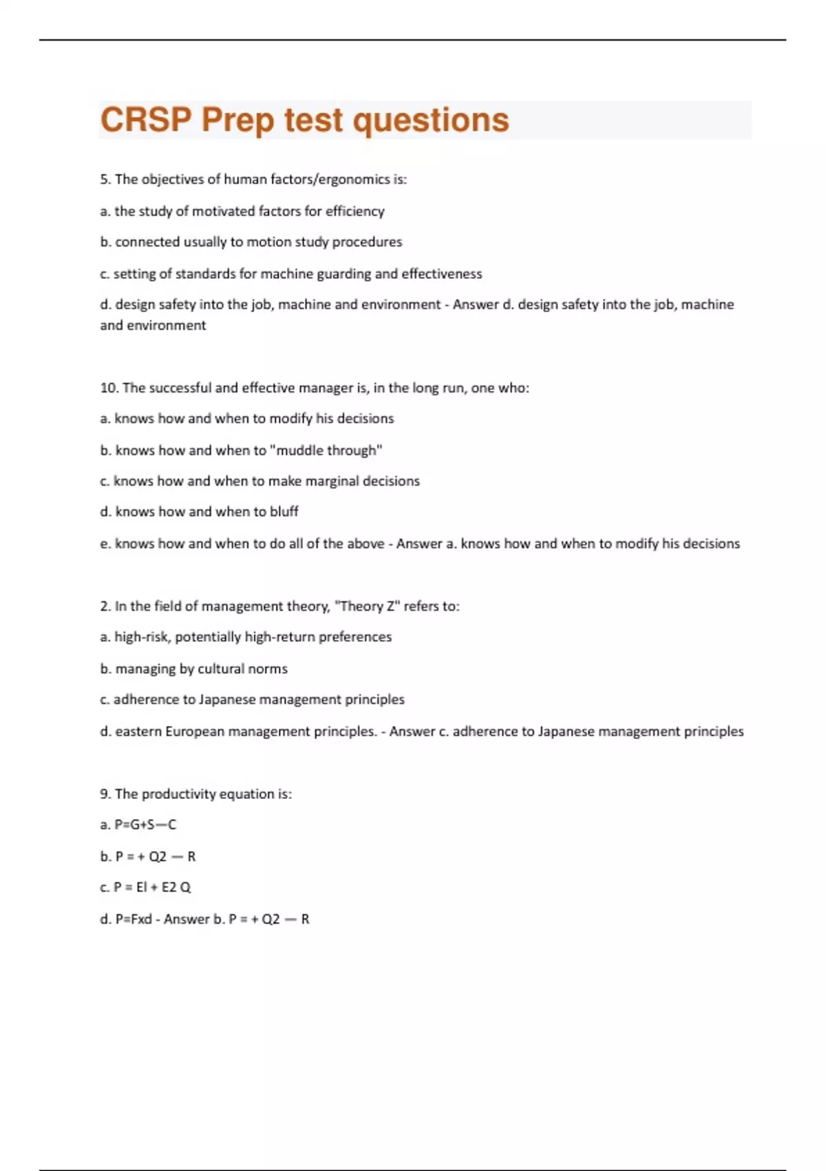 5. The objectives of human factors/ergonomics is: a. the study of motivated factors for efficiency b. connected usually to motion study procedures c. setting of standards for machine guarding and effectiveness d. design safety into the job, machine and environment - Answer d. design safety into the job, machine and environment 10. The successful and effective manager is, in the long run, one who: a. knows how and when to modify his decisions b. knows how and when to "muddle through" c. knows how and when to make marginal decisions d. knows how and when to bluff e. knows how and when to do all of the above - Answer a. knows how and when to modify his decisions 2. In the field of management theory, "Theory Z" refers to: a. high-risk, potentially high-return preferences b. managing by cultural norms c. adherence to Japanese management principles d. eastern European management principles. - Answer c. adherence to Japanese management principles 9. The productivity equation is: a. P=G+S—C b. P = + Q2 — R c. P = El + E2 Q d. P=Fxd - Answer b. P = + Q2 — R8. A measure of the quantity and quality work performance with a good, non-wasteful use of resources is called: a. productivity b. efficiency c. effectiveness d. goal attainment - Answer a. productivity 11. Who said "... effectiveness is doing the right thing, but efficiency is doing the thing right": a. Aristotle b. Drucker c. Deming d. Mark Twain - Answer b. Drucker