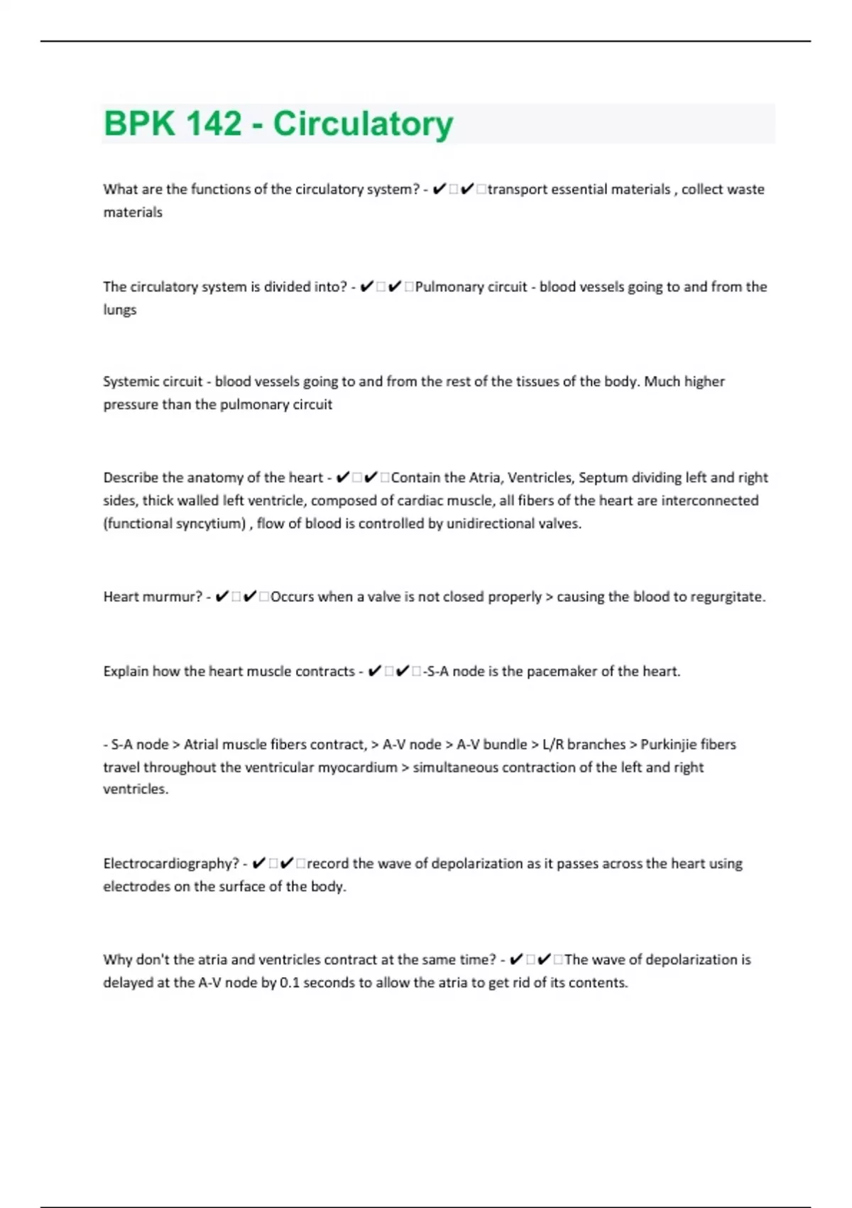 What are the functions of the circulatory system? - ️️transport essential materials , collect waste materials The circulatory system is divided into? - ️️Pulmonary circuit - blood vessels going to and from the lungs Systemic circuit - blood vessels going to and from the rest of the tissues of the body. Much higher pressure than the pulmonary circuit Describe the anatomy of the heart - ️️Contain the Atria, Ventricles, Septum dividing left and right sides, thick walled left ventricle, composed of cardiac muscle, all fibers of the heart are interconnected (functional syncytium) , flow of blood is controlled by unidirectional valves. Heart murmur? - ️️Occurs when a valve is not closed properly > causing the blood to regurgitate. Explain how the heart muscle contracts - ️️-S-A node is the pacemaker of the heart. - S-A node > Atrial muscle fibers contract, > A-V node > A-V bundle > L/R branches > Purkinjie fibers travel throughout the ventricular myocardium > simultaneous contraction of the left and right ventricles. Electrocardiography? - ️️record the wave of depolarization as it passes across the heart using electrodes on the surface of the body. Why don't the atria and ventricles contract at the same time? - ️️The wave of depolarization is delayed at the A-V node by 0.1 seconds to allow the atria to get rid of its contents.