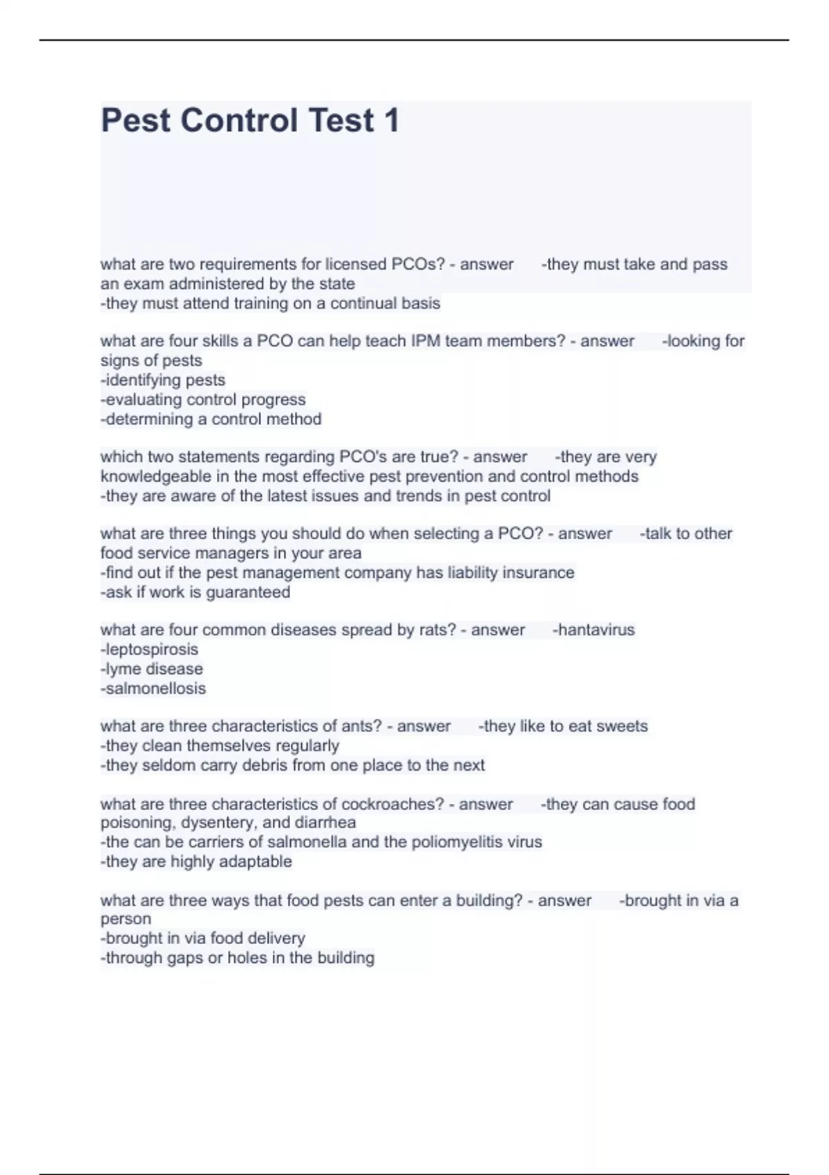 Pest Control Test 1 Questions and Answers Fully solved