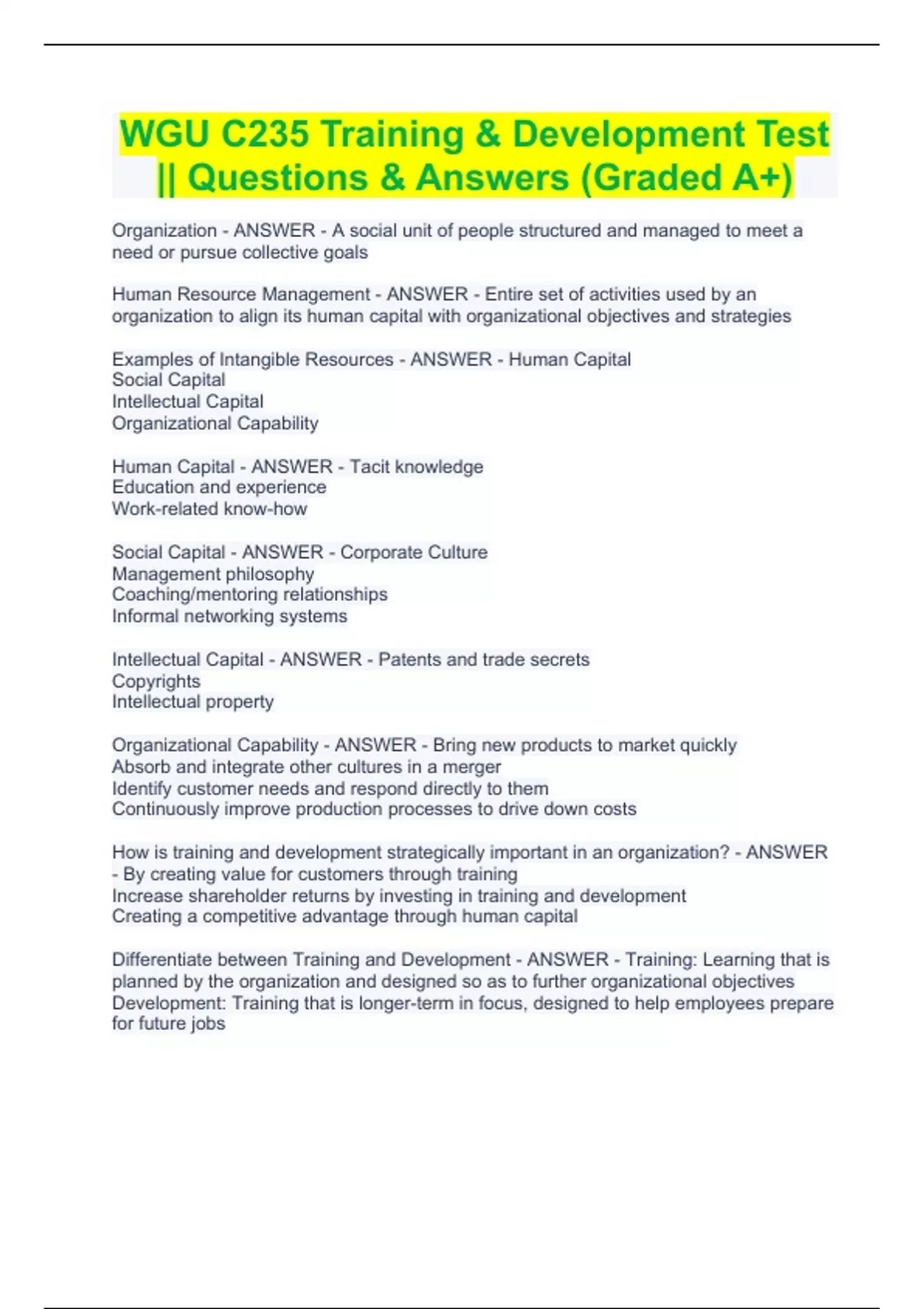 WGU C235 Training & Development Test || Questions & Answers (Graded A+) WGU C235 Training & Development Test || Questions & Answers (Graded A+) Organization - ANSWER - A social unit of people structured and managed to meet a need or pursue collective goals Human Resource Management - ANSWER - Entire set of activities used by an organization to align its human capital with organizational objectives and strategies Examples of Intangible Resources - ANSWER - Human Capital Social Capital Intellectual Capital Organizational Capability Human Capital - ANSWER - Tacit knowledge Education and experience Work-related know-how Social Capital - ANSWER - Corporate Culture Management philosophy Coaching/mentoring relationships Informal networking systems Intellectual Capital - ANSWER - Patents and trade secrets Copyrights Intellectual property Organizational Capability - ANSWER - Bring new products to market quickly Absorb and integrate other cultures in a merger Identify customer needs and respond directly to them Continuously improve production processes to drive down costs How is training and development strategically important in an organization? - ANSWER - By creating value for customers through training Increase shareholder returns by investing in training and development Creating a competitive advantage through human capital Differentiate between Training and Development - ANSWER - Training: Learning that is planned by the organization and designed so as to further organizational objectives Development: Training that is longer-term in focus, designed to help employees prepare for future jobs What is an intangible asset on which a company can build a sustainable competitive advantage by providing training regarding tacit knowledge in an effort to differentiate itself in a strategic way? - ANSWER - Human Capital