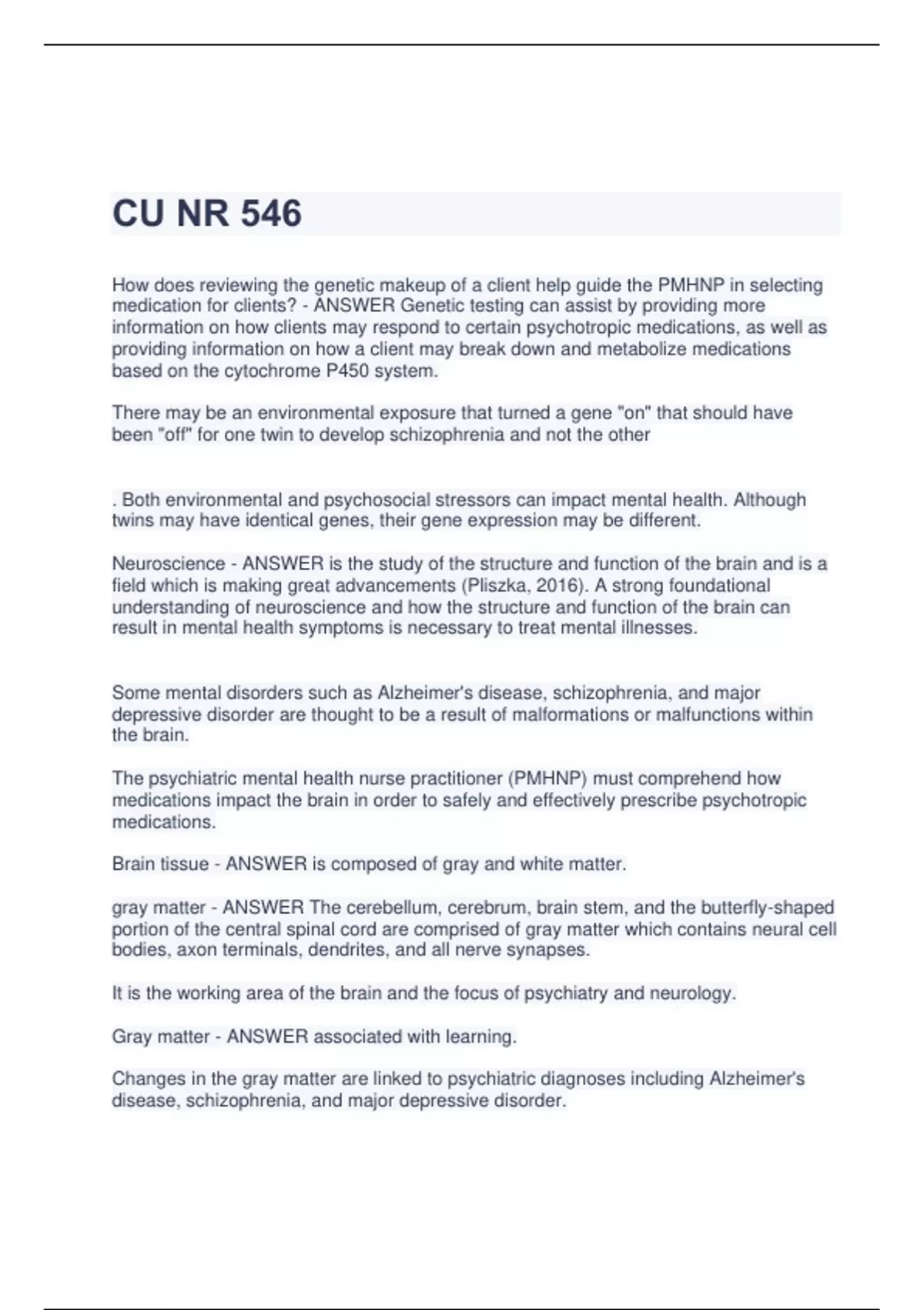 How does reviewing the genetic makeup of a client help guide the PMHNP in selecting medication for clients? - ANSWER Genetic testing can assist by providing more information on how clients may respond to certain psychotropic medications, as well as providing information on how a client may break down and metabolize medications based on the cytochrome P450 system. There may be an environmental exposure that turned a gene "on" that should have been "off" for one twin to develop schizophrenia and not the other . Both environmental and psychosocial stressors can impact mental health. Although twins may have identical genes, their gene expression may be different. Neuroscience - ANSWER is the study of the structure and function of the brain and is a field which is making great advancements (Pliszka, 2016). A strong foundational understanding of neuroscience and how the structure and function of the brain can result in mental health symptoms is necessary to treat mental illnesses. Some mental disorders such as Alzheimer's disease, schizophrenia, and major depressive disorder are thought to be a result of malformations or malfunctions within the brain. The psychiatric mental health nurse practitioner (PMHNP) must comprehend how medications impact the brain in order to safely and effectively prescribe psychotropic medications. Brain tissue - ANSWER is composed of gray and white matter. gray matter - ANSWER The cerebellum, cerebrum, brain stem, and the butterfly-shaped portion of the central spinal cord are comprised of gray matter which contains neural cell bodies, axon terminals, dendrites, and all nerve synapses. It is the working area of the brain and the focus of psychiatry and neurology. Gray matter - ANSWER associated with learning. Changes in the gray matter are linked to psychiatric diagnoses including Alzheimer's disease, schizophrenia, and major depressive disorder. White Matter - ANSWER contains nerve fibers that connect neurons from different regions into functional circuits. The myelin that coats neuronal axons is necessary for electrical impulse transmission. Think of the white matter as a transit system. If there are breaks in the system, then people cannot get to their destinations. Within the brain, these breaks affect neural communication, affecting behavior. Damage to the myelin can impair transmission which can impact not only sensory and motor function, but also cognition. White matter abnormalities are associated with autism and vascular dementia. The central sulcus separates which lobes? - ANSWER frontal lobe from parietal lobe Frontal lobe - ANSWER Associated with movement, intelligence, abstract thinking. etc. Broca's area - ANSWER Speech Temporal lobe - ANSWER Involves object identification and auditory signals Cerebellum - ANSWER coordination and balance Wernicke's area - ANSWER Speech comprehension occipital lobe - ANSWER Primary visual area parietal lobe - ANSWER Keeps us alert to what is going on around us Sensory Cortex - ANSWER Pain, heat, and other sensations motor cortex - ANSWER Movement Hippocampus - ANSWER Involved in both memory and anxiety Nucleus accumbens - ANSWER Involved in the reward process. Thalamus - ANSWER Involved in sensory organ and motor command processing Striatum - ANSWER Involved in complex motor actions, also links cognition to motor actions Limbic System - ANSWER This includes circuits that are associated with pleasure and reward, emotion and learning Basal ganglia - ANSWER A group of structures involved in voluntary motor movements Amygdala - ANSWER Involved in emotional regulation and perception of odors Corpus callosum - ANSWER Controls the communication between the two brain hemispheres white matter - ANSWER Contains nerve fibers that connect neurons from different regions into functional circuits Grey matter - ANSWER Contains nerve cells and dendrites Brain tissue - ANSWER Made up of grey matter and white matter What is the global burden of disease of mental health, neurological, and substance use disorders? - ANSWER 30% How many children and adolescents are impacted by mental health disorders worldwide? - ANSWER 20% How much does lost productivity related to anxiety and depression cost the global economy each - ANSWER $1 trillion USD The development of mental health conditions are linked to causes - ANSWER such as genetics, biochemical processes, environment, and lifestyle. Mental illness is common, and treatment often includes the use of psychotropic medications. When prescribing medications, the psychiatric mental health nurse practitioner (PMHNP) must consider each client's unique circumstances including, but not limited to their: - ANSWER symptoms age physical health previous response to treatment lifestyle Treatment for mental health conditions requires - ANSWER individualized care that incorporates the client's desires and goals. Which is the priority data used to determine a treatment plan for mental health disorders? - ANSWER client symptoms Adherence - ANSWER can be defined as persistence or compliance.