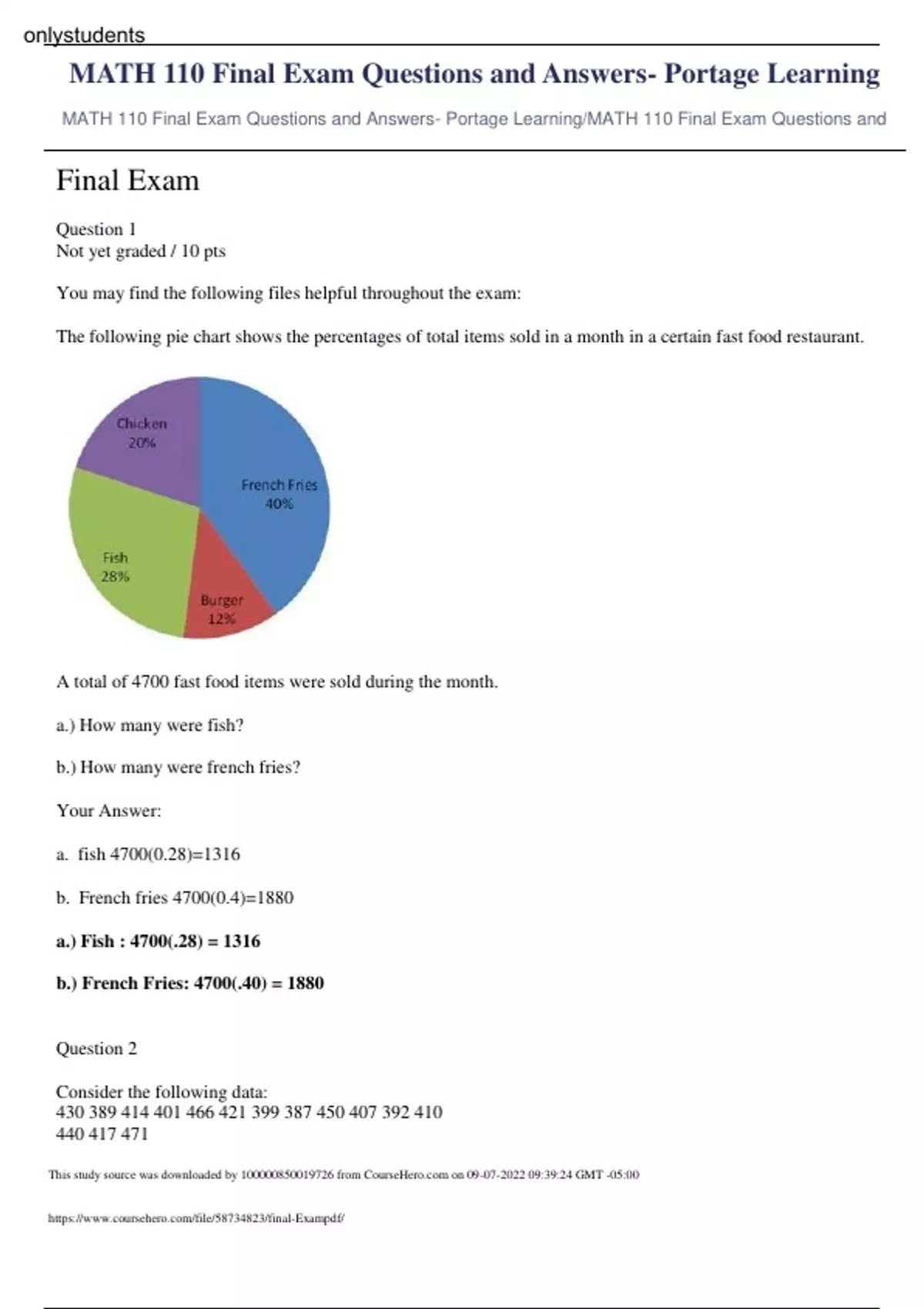 MATH 110 Final Exam Questions and Answers- Portage Learning Final Exam Question 1 Not yet graded / 10 pts You may find the following files helpful throughout the exam: The following pie chart shows the percentages of total items sold in a month in a certain fast food restaurant. A total of 4700 fast food items were sold during the month. a.) How many were fish? b.) How many were french fries? Your Answer: a. fish 4700(0.28)=1316 b. French fries 4700(0.4)=1880 a.) Fish : 4700(.28) = 1316 b.) French Fries: 4700(.40) = 1880