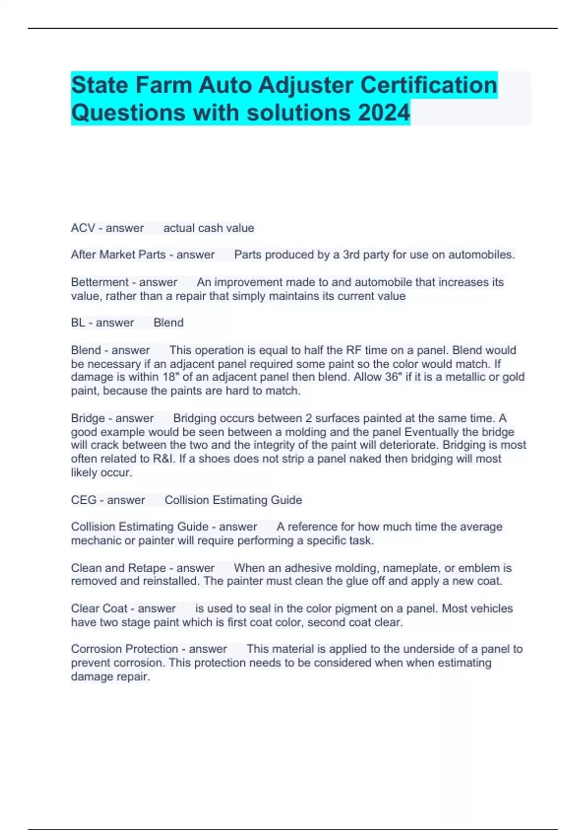 State Farm Auto Adjuster Certification Questions with solutions 2024 ACV actual cash value After Market Parts Parts produced by a 3rd party for use on automobiles. Brainpower Read More Previous Play Next Rewind 10 seconds Move forward 10 seconds Unmute 0:07 / 0:15 Full screen Betterment An improvement made to and automobile that increases its value, rather than a repair that simply maintains its current value BL Blend Blend This operation is equal to half the RF time on a panel. Blend would be necessary if an adjacent panel required some paint so the color would match. If damage is within 18" of an adjacent panel then blend. Allow 36" if it is a metallic or gold paint, because the paints are hard to match. Bridge Bridging occurs between 2 surfaces painted at the same time. A good example would be seen between a molding and the panel Eventually the bridge will crack between the two and the integrity of the paint will deteriorate. Bridging is most often related to R&I. If a shoes does not strip a panel naked then bridging will most likely occur. CEG Collision Estimating Guide Collision Estimating Guide A reference for how much time the average mechanic or painter will require performing a specific task. Clean and Retape When an adhesive molding, nameplate, or emblem is removed and reinstalled. The painter must clean the glue off and apply a new coat. Clear Coat is used to seal in the color pigment on a panel. Most vehicles have two stage paint which is first coat color, second coat clear. Corrosion Protection This material is applied to the underside of a panel to prevent corrosion. This protection needs to be considered when when estimating damage repair. Deductible An amount, stated on the policy , for which the policy holder is responsible. Deductibles are assessed on a per incident basis. Depreciation The decrease in the market value of a vehicle over time. The amount of yearly depreciation is affected by variables including car condition, resale market supply and demand, and reputation of the manufacturer and or model. DOL Date of Loss Date of Loss The date when the damage occurred. EFS Estimator Fact Sheet Estimator Fact Sheet the fact sheet is accompanied with each claim. Before evaluating the damage you will need to verify all information on the efs. It will have important information such as the deductible, VIN, and date of loss. Flex Additive This is added to the paint when applying it to a plastic part. Plastic parts will bend slightly with wind and the paint must be flexible to prevent cracking. HSLA High Strength Low Alloy High Strength Low Alloy A high strength, light weight metal commonly used for hoods on some pickups and cars. HLSA requires more heat and is difficult to repair. Indemnify An insurance company is responsible to return their policy holder to Pre-Loss conditions. LKQ Like Kind and Quality Like Kind and Quality Used parts of similar quality to those they are replacing. These will most likely be used when it is difficult or impossible to get new OEM parts. Long Expansion Commonly called the "snowflake" in Mitchell. It will be your best friend. Long Expansion contains often repeated operations that will be used in writing an estimate. Magnuson - Moss Act Manufacturer cannot void a warranty if aftermarket parts are used as long as the aftermarket parts meet or exceed the manufacturer's specifications. Masking Protecting an area from paint application. Typically masking is a covered operation for most painting, but occasionally we will have to cover additional masking. NAGS National Auto Glass Specifications National Auto Glass Specifications Aftermarket glass, gennerally heavily discounted and usually cheaper than OEM glass. OTH Other than Hail Other than hail This is when damage on the vehicle is obviously not caused by hail.. It is important to remember. Hail will not scratch paint. Overlap Overlap pertaining to estimatics occurs when two adjacent panels will share common procedures such as masking for prep. An example of overlap would be a hood and fender panel requiring refinishing. The hood would be the first major panel on the estimate and the fender would follow with a 0.4 deduction to account or the overlap time The 0.4 hr accounts for prep and masking which is removed from the operation of refinishing because the panels are adjacent. It is important to understand overlap because the estimatic software will remove overlap as the estimate is being created. P-Pages Procedure Pages Procedure Pages Where you would find what is included in a R&R operation. Panel Refers to an exterior panel, such as a hood or fender. It could be plastic, fiberglass, or metal. Paint code Found on the firewall or inside the drivers side door. This defines the manufactured paint color. Important for distinguishing between two and three stage paints.