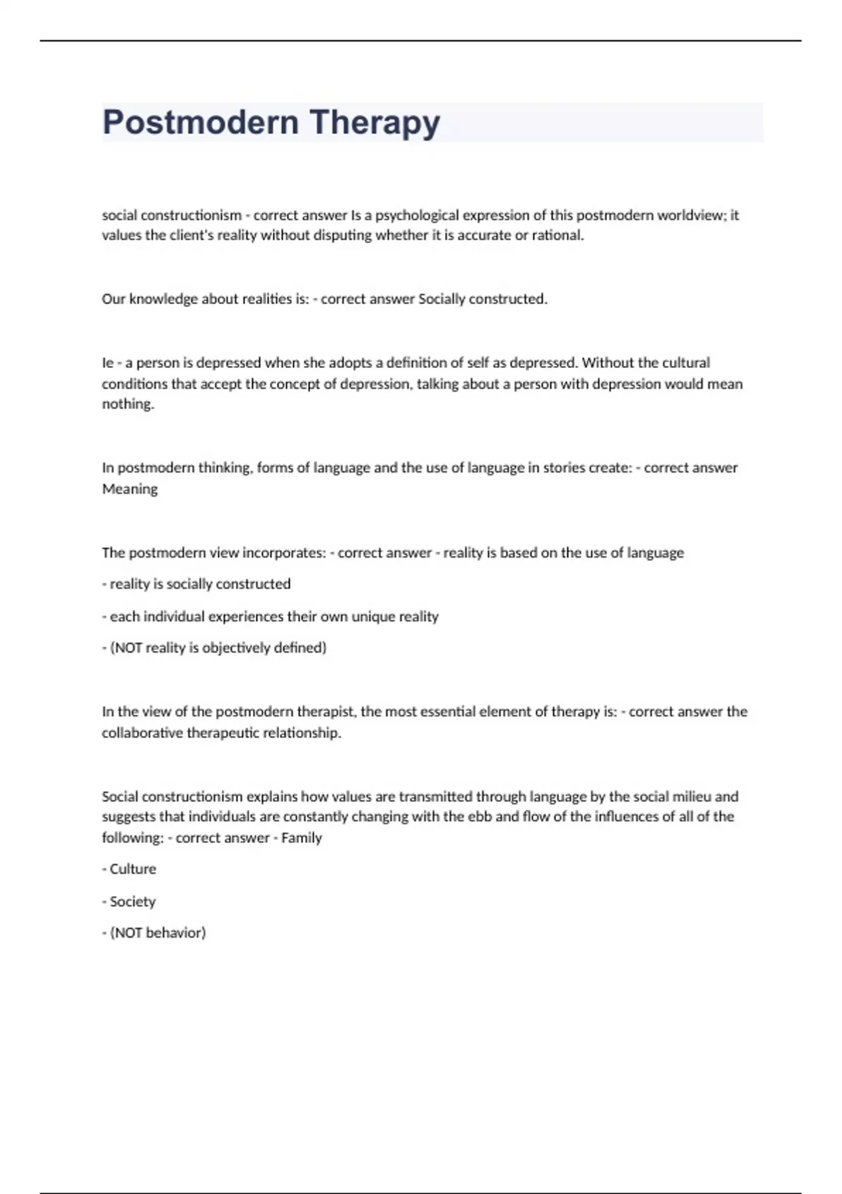 Postmodern Therapy Question and answers correctly solved 2023/2024social constructionism - correct answer Is a psychological expression of this postmodern worldview; it values the client's reality without disputing whether it is accurate or rational. Our knowledge about realities is: - correct answer Socially constructed. Ie - a person is depressed when she adopts a definition of self as depressed. Without the cultural conditions that accept the concept of depression, talking about a person with depression would mean nothing. In postmodern thinking, forms of language and the use of language in stories create: - correct answer Meaning The postmodern vie