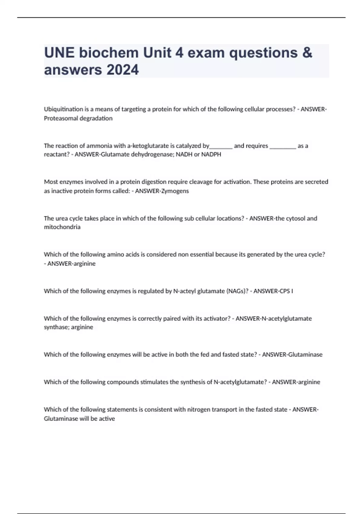 UNE biochem Unit 4 exam questions & answers 2024 Ubiquitination is a means of targeting a protein for which of the following cellular processes? - ANSWER-Proteasomal degradation The reaction of ammonia with a-ketoglutarate is catalyzed by_______ and requires ________ as a reactant? - ANSWER-Glutamate dehydrogenase; NADH or NADPH Most enzymes involved in a protein digestion require cleavage for activation. These proteins are secreted as inactive protein forms called: - ANSWER-Zymogens The urea cycle takes place in which of the following sub cellular locations? - ANSWER-the cytosol and mitochondria Which of the following amino acids is considered non essential because its generated by the urea cycle? - ANSWER-arginine Which of the following enzymes is regulated by N-acteyl glutamate (NAGs)? - ANSWER-CPS I Which of the following enzymes is correctly paired with its activator? - ANSWER-N-acetylglutamate synthase; arginine Which of the following enzymes will be active in both the fed and fasted state? - ANSWER-Glutaminase Which of the following compounds stimulates the synthesis of N-acetylglutamate? - ANSWER-arginine Which of the following statements is consistent with nitrogen transport in the fasted state - ANSWER-Glutaminase will be active