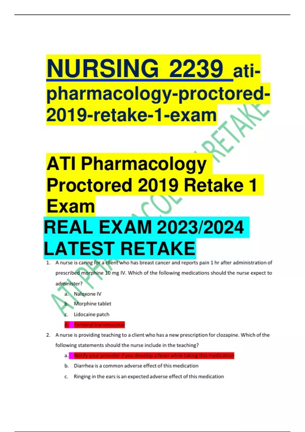 2019 -retake -1-exam ATI Pharmacology Proctored 2019 Retake 1 Exam REAL EXAM 2023/2024 LATEST RETAKE 1. A nurse is caring for a client who has breast cancer and reports pain 1 hr after administration of prescribed morphine 10 mg IV. Which of the following medications should the nurse expect to administer? a. Naloxone IV b. Morphine tablet c. Lidocaine patch d. Fentanyl transmucosal 2. A nurse is providing teaching to a client who has a new prescription for clozapine. Which of the following statements should the nurse include in the teaching? a. Notify your provider if you develop a fever while taking this medication b. Diarrhea is a common adverse effect of this medication c. Ringing in the ears is an expected adverse effect of this medication d. You might experience weight loss while taking this medication 3. A nurse is assessing a client after administering phenytoin IV bolus for a seizure. Which of the following findings should the nurse identify as an adverse effect of the medication? a. Bradycardia b. Red man syndrome c. Hypoglycemia d. Hypotension 4. A client who has active TB and is taking rifampin reports that his urine and sweat have developed a red-orange tinge. Which of the following actions should the nurse take? a. Document this as an expected finding b. Prepare the client for dialysis c. Check the client’s liver functions d. Instruct the client to increase his fluid intake 5. A home health nurse is visiting a client who has heart failure and a prescription for furosemide. The nurse identifies that the client has gained 2.5 kg since the last visit 2 days ago. Which of the following actions should the nurse take first?