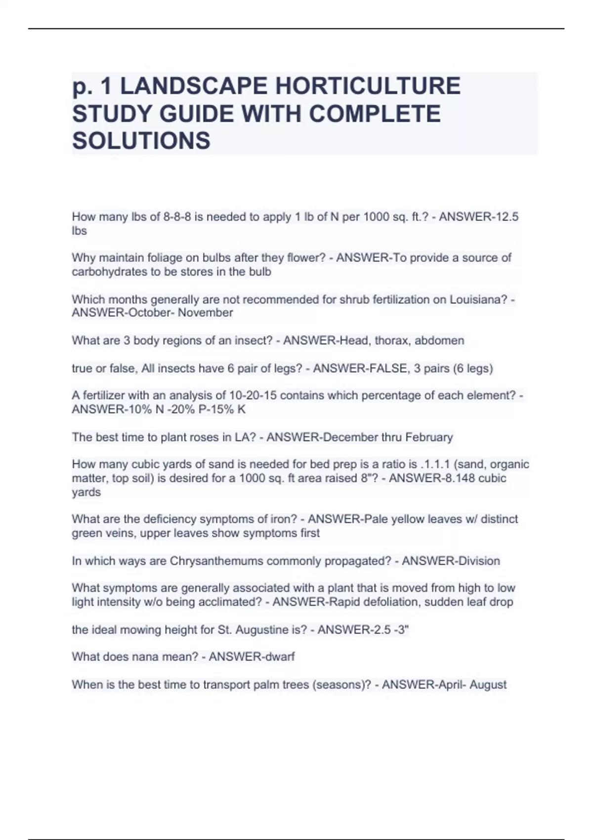 p. 1 LANDSCAPE HORTICULTURE STUDY GUIDE WITH COMPLETE SOLUTIONS