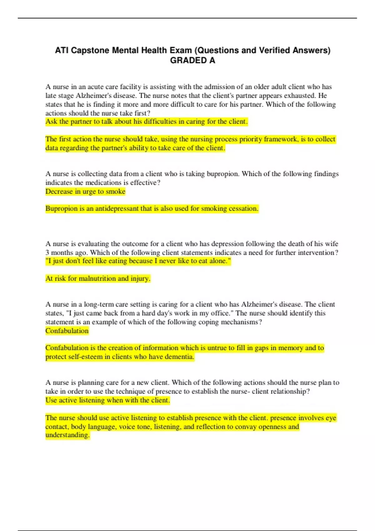 ATI Capstone Mental Health Exam (Questions and Verified Answers) GRADED A