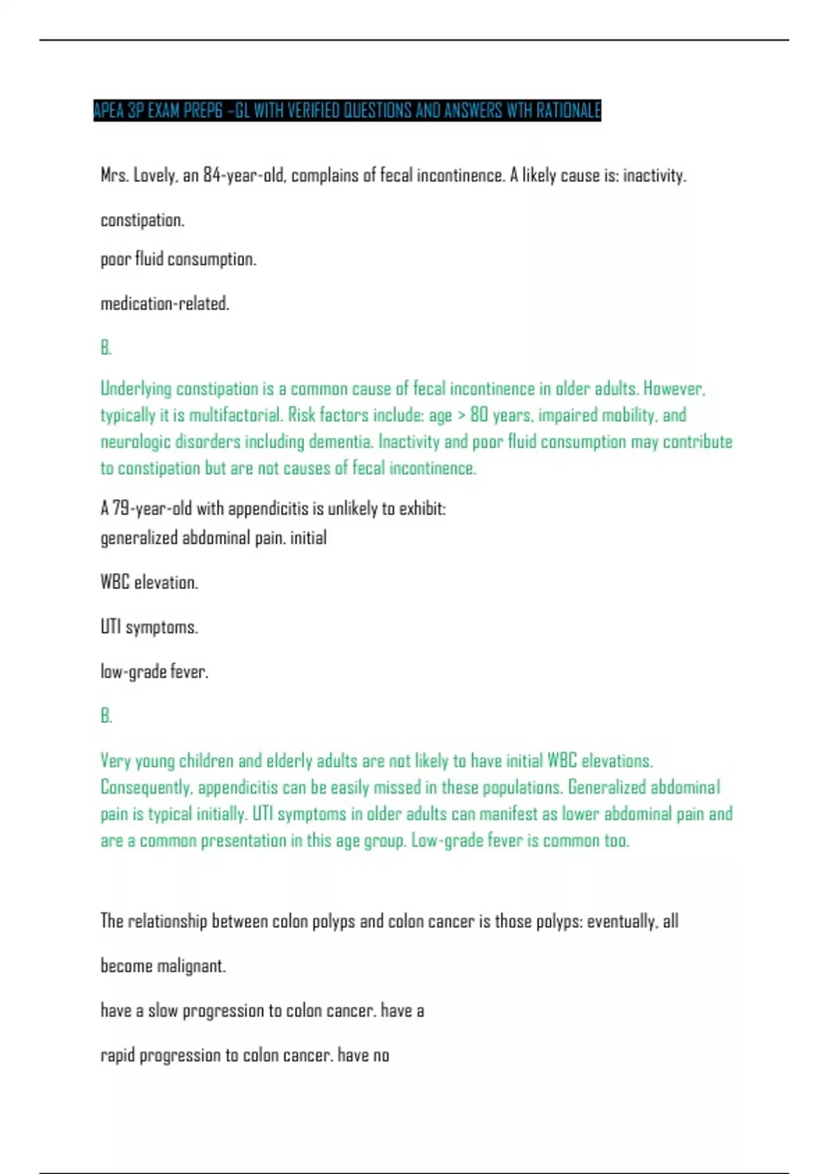 APEA 3P EXAM PREP6 –GL WITH VERIFIED QUESTIONS AND ANSWERS WTH RATIONALE Mrs. Lovely, an 84-year-old, complains of fecal incontinence. A likely cause is: inactivity. constipation. poor fluidconsumption. medication-related. B. Underlying constipation is a common cause of fecal incontinence in older adults. However, typically it is multifactorial. Risk factors include: age > 80 years, impaired mobility, and neurologic disorders including dementia. Inactivity and poor fluid consumption may contribute to constipation but are not causes of fecal incontinence. A 79-year-old withappendicitisisunlikely to exhibit: generalized abdominal pain. initial WBC elevation. UTI symptoms. low-gradefever. B. Very young children and elderly adults are not likely to have initial WBC elevations. Consequently, appendicitis can be easily missed in these populations. Generalized abdominal pain is typical initially. UTI symptoms in older adults can manifest as lower abdominal pain and are a common presentation in this age group. Low-grade fever is common too. The relationship between colon polyps and colon cancer is those polyps: eventually, all become malignant. have a slow progression to colon cancer. have a rapid progression to colon cancer. have no relationship to colon cancer. B. Colon polyps are usually slow-growing and take a long time to progress to cancer. This is the reason that a colonoscopy does not need to be repeated annually. While not all polyps grow slowly, this is the usual progression. A 5-year-old has been diagnosed with pinworms. He lives with his mother. There are no other members of the household. How should his mother be managed? Reassure the mother that if she develops symptoms, she will need to be treated. Visually assess the mother’s rectum for redness or presence of worms. Have the mother collect a stool specimen and send it to the laboratory. Perform the “scotch tape” test and look at the collection under the microscope. D. The diagnosis of pinworms (Enterobiasis) is made by using a piece of scotch tape on a tongue depressor. It is touched against the patient’s rectum. The greatest yield of eggs will occur during the nighttime or early AM. Eggs will be found here if they are present. Worms and eggs are rarely found in stool specimens, so this is not a good plan. When the scotch tape is examined under a low power microscope, the eggs will be easily visualized since they are large and bean shaped. The finding of an adult worm would confirm the diagnosis. These are large enough to be seen with the naked eye. If the mother is symptomatic, she should be treated with or without a rectal exam. It is very likely she is infected. A patienthasbeendiagnosed withhepatitis B.The mostcommonlyreportedrisk factor is: drinkingcontaminated water. eating contaminated food. exposure to blood. sexual exposure. D. Hepatitis B is transmitted by blood and body fluids. While exposure to infected blood or blood products would significantly increase the risk of infection in unvaccinated people, this is much less likely than becoming infected via sexual exposure or IV drug use. Hepatitis A is transmitted via fecal-oral routes. Drinking contaminated water and eating contaminated food implicate hepatitis A as the etiologic agent. The three most common causes of bacterial diarrhea in the US are Salmonella, Campylobacter, and: E. coli. Enterovirus. Yersinia. Shigella. D. Shigella will be shed continuously in the stool and should be easily identified on stool culture. When bacterial gastroenteritis is suspected, a stool specimen could be ordered for confirmation. Generally, these three pathogens are easily identified if they are present. Enterovirus produces a viral form of diarrhea. Yersinia produces the deadly disease called bubonic plague. E. coli is a typical colonic pathogen. An 83-year-old patient is diagnosed with diverticulitis. The most common complaint is: rectal bleeding. bloating and cramping. left lower quadrant pain. frequent belchingandflatulence. C. Diverticular disease is more common in older adults. About 70% of patients diagnosed with diverticulitis have left lower quadrant pain. Rectal bleeding may have varied etiologies, such as rectal carcinoma or hemorrhoids. Bloating and cramping are often found in patients with diverticular disease (diverticulosis) but not specifically diverticulitis. Belching and flatulence are not specifically associated with diverticulosis. What is true regarding older adults who are overweight? This is clearly associated with increased mortality in older adults. Mortality in older adults related to overweight states declines over time. BMI is a good way to assess nutritional status in older adults. There arenopotential metabolic or functional benefits to weight loss in older adults. B. Overweight and obese states are not as important in predicting mortality in older adults as they are in their younger counterparts. After age 65 years (some studies demonstrate after age 70), weight is less significant in decreasing risk for mortality than in younger adults. There are some benefits to weight loss in the obese older adults. One of them is better balance and decreased risk for falls. Others include less sleep apnea, decreased risk of diabetes, and decreased rates of shortness of breath with respiratory and cardiac diseases. What medication used to treat patients who have GERD provides the fastest relief of heartburn symptoms? Calcium carbonate Ranitidine Amantadine Pantoprazole A. Calcium carbonate is an antacid. It provides rapid changes in gastric pH. This provides relief that can be noticed immediately. The increase in pH lasts for about 30 minutes and corresponds with resolution of symptoms. However, as pH decreases within 30 minutes, symptoms may return. Ranitidine is an H2 blocker. It provides relief in 1-2 hours. This usually lasts for about 6-12 hours. Amantadine is an antiviral not used to treat GERD. Pantoprazole is a proton pump inhibitor. This provides re
