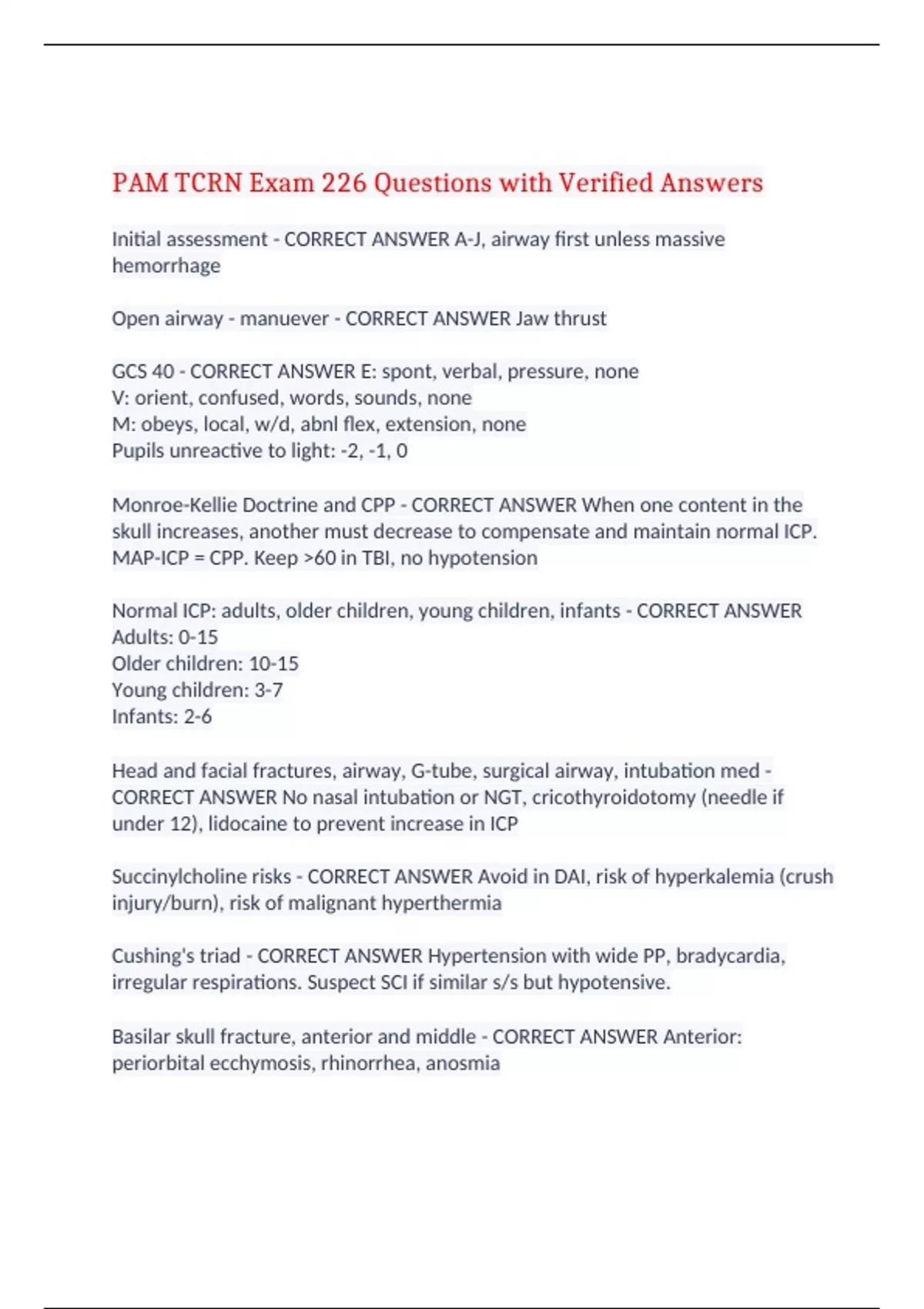 PAM TCRN Exam 226 Questions with Verified Answers Initial assessment - CORRECT ANSWER A-J, airway first unless massive hemorrhage Open airway - manuever - CORRECT ANSWER Jaw thrust GCS 40 - CORRECT ANSWER E: spont, verbal, pressure, none V: orient, confused, words, sounds, none M: obeys, local, w/d, abnl flex, extension, none Pupils unreactive to light: -2, -1, 0 Monroe-Kellie Doctrine and CPP - CORRECT ANSWER When one content in the skull increases, another must decrease to compensate and maintain normal ICP. MAP-ICP = CPP. Keep >60 in TBI, no hypotension Normal ICP: adults, older children, young children, infants - CORRECT ANSWER Adults: 0-15 Older children: 10-15 Young children: 3-7 Infants: 2-6 Head and facial fractures, airway, G-tube, surgical airway, intubation med - CORRECT ANSWER No nasal intubation or NGT, cricothyroidotomy (needle if under 12), lidocaine to prevent increase in ICP Succinylcholine risks - CORRECT ANSWER Avoid in DAI, risk of hyperkalemia (crush injury/burn), risk of malignant hyperthermia Cushing's triad - CORRECT ANSWER Hypertension with wide PP, bradycardia, irregular respirations. Suspect SCI if similar s/s but hypotensive. Basilar skull fracture, anterior and middle - CORRECT ANSWER Anterior: periorbital ecchymosis, rhinorrhea, anosmia Middle: otorrhea, mastoid ecchymosis, hemotympanum (increased risk of infection) Epidural hematoma - 4 points - CORRECT ANSWER a. Middle meningeal artery from temporal skull fx b. Rapid onset w/ lucid interval c. Uncal herniation: ipsilateral pupil, contralateral hemiparesis d. Burr hole Subdural hematoma - 4 points - CORRECT ANSWER a. Tearing of venous bridging veins b. Slower decamp of mental status c. Elderly on blood thinners, ETOH d. Shaken impact syndrome: SDH, retinal hemorrhage, posterior rib fx Concussion - 3 points - CORRECT ANSWER a. Cognitive rest b. No ASA or NSAIDS - APAP only c. Graduated return to play Diffuse axonal injury - CORRECT ANSWER Prolonged coma, hyperthermia, HTN, profuse sweating, posturing Pharmacological mgmt of increased ICP - CORRECT ANSWER Hypertonic saline if hypotensive Mannitol - osmotic diuretic, 1 gm/kg, onset 1-5 min, peak 20-60 minutes. Monitor for pulmonary edema, K, Na, serum osmolality (300-320), Treatment of increased ICP - CORRECT ANSWER SBP >100, no permissive hypotension CO2 35-37 Elevate HOB 30-45, neutral alignment Limit stimulation, treat anxiety and pain Treat fevers aggressively Early interventions to avoid long term complications of TBI - CORRECT ANSWER Early nutrition - reduces stress ulcers, sepsis, helps with wound healing DVT prophylaxis and early mobilization Treat hyperglycemia (80-120) Welder with metal in eye - CORRECT ANSWER Check for rust ring in 24-48 hours Ocular burns - alkaline - CORRECT ANSWER Worse than acid, irrigate with warm saline until pH 7-7.4 Ruptured globe - CORRECT ANSWER Teardrop-shaped pupil Orbital fracture - CORRECT ANSWER Exophthalmos - blow out, enophthalmos - blow in. Pressure on CN3, pain and limited upward gaze Hyphema - CORRECT ANSWER Blood in anterior chamber, reddish hue to vision, keep upright, biggest re-bleed risk 3-5 days Specialty consult - facial injuries - CORRECT ANSWER Lac of vermillion border, lacrimal gland disruption Facial injuries - general considerations - CORRECT ANSWER Don't shave - especially eyebrows, caution using xylocaine with epi in ear/nose Mandibular fracture - CORRECT ANSWER Malocclusion, lower lip/jaw parasthesia, airway issues 2/2 loss of tongue control LeFort fractures - CORRECT ANSWER I: free-floating maxilla, lip lac II: pyramid-shaped, nasal fracture III: complete cranio-facial separation Strangulation - CORRECT ANSWER Consider stroke-like symptoms from blood clots Neck zones - CORRECT ANSWER 1. Clavicle to cricoid cartilage 2. Cricoid cartilage to angle of the mandible 3. Angle of mandible to base of skull Most COMMON in 2, most LETHAL in 1 Tracheobronchial injury - CORRECT ANSWER Clothesline-type or penetrating injury Hamman's sign (crunch w/heartbeat) and SQ emphysema Dysphonia, stridor, increasing hematoma Fiberoptic intubation, surgical repair SCI falls from height numbers - CORRECT ANSWER 3x height - child >20 feet, adults Canadian C-Spine rule - CORRECT ANSWER dangerous MOI, numbness/tingling NEXUS criteria - CORRECT ANSWER Distracting injury, intoxication, cervical tenderness, alertness, focal deficit Chance fracture - CORRECT ANSWER Seat belt fracture, assoc w/ hollow organ injury SCIWORA in young children - CORRECT ANSWER Get MRI Neurogenic shock - CORRECT ANSWER Distributive - low SVR Unopposed parasympathetic Bradycardia, bradypnea, poikilothermia, priapism, anhydrosis, hypotension Fluids and pressers Spinal shock - CORRECT ANSWER Transient flaccidity Horner's syndrome - CORRECT ANSWER "PAM is Horny" -Ptosis -Anhidrosis -Miosis (constricted pupil) High cervical lesions Incomplete SCI - CORRECT ANSWER Anterior: most common, motor loss, V/P spared Central: motor, upper, distal Brown-sequard: ipsilateral motor, contralateral pain and temp usually penetrating Rib fracture locations and injuries - CORRECT ANSWER 1-2: great vessle Lower R: liver Lower L: spleen Aortic dissection - mechanism and location - CORRECT ANSWER Blunt trauma, ligamentum arteriosum Aortic dissection treatment - CORRECT ANSWER Labetalol to keep HR 60-80 and SBP 100-120, IVF Aortic dissection s/s - CORRECT ANSWER New systolic murmur, widened mediastinum, obscured aortic knob on CXR Pulmonary contusion s/s, considerations - CORRECT ANSWER Wheezing/crackles, risk of ARDS, careful with fluids, O2 PRN ARDS: P/F ratio and treatment - CORRECT ANSWER <200, recruit alveoli with low Vt and PEEP, prone positioning and HF ventilation Pulmonary embolism - CORRECT ANSWER Sudden onset of restlessness, dyspnea, hypoxemia. CT PE is gold standard. Flail chest - CORRECT ANSWER Fractures of >2 adjacent ribs in 2 or more places, fixation required Open pneumothorax - CORRECT ANSWER Sucking chest wound, 3-sided occlusive dressing, remove if worried a