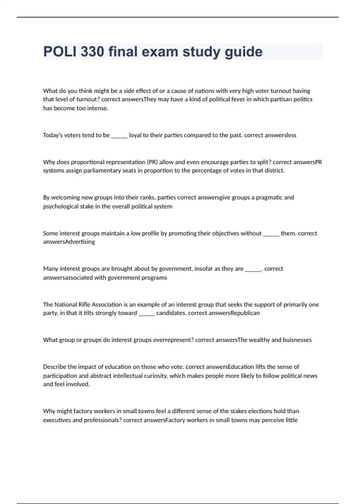 What do you think might be a side effect of or a cause of nations with very high voter turnout having that level of turnout? correct answersThey may have a kind of political fever in which partisan politics has become too intense. Today's voters tend to be _____ loyal to their parties compared to the past. correct answersless Why does proportional representation (PR) allow and even encourage parties to split? correct answersPR systems assign parliamentary seats in proportion to the percentage of votes in that district. By welcoming new groups into their ranks, parties correct answersgive groups a pragmatic and psychological stake in the overall political system Some interest groups maintain a low profile by promoting their objectives without _____ them. correct answersAdvertising Many interest groups are brought about by government, insofar as they are _____. correct answersassociated with government programs The National Rifle Association is an example of an interest group that seeks the support of primarily one party, in that it tilts strongly toward _____ candidates. correct answersRepublican What group or groups do interest groups overrepresent? correct answersThe wealthy and buisnesses Describe the impact of education on those who vote. correct answersEducation lifts the sense of participation and abstract intellectual curiosity, which makes people more likely to follow political news and feel involved.
