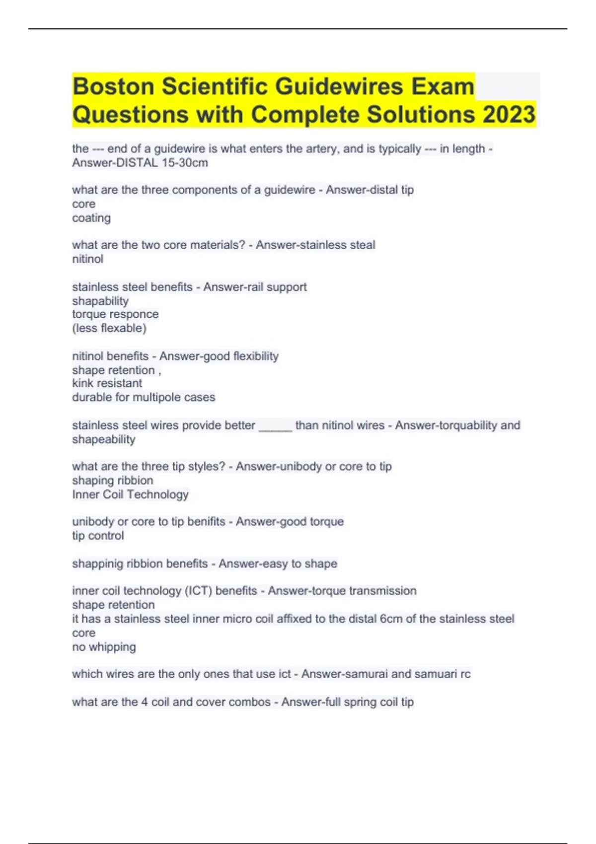Guidewires Boston Scientific Exam Questions with Complete Solutions 2023