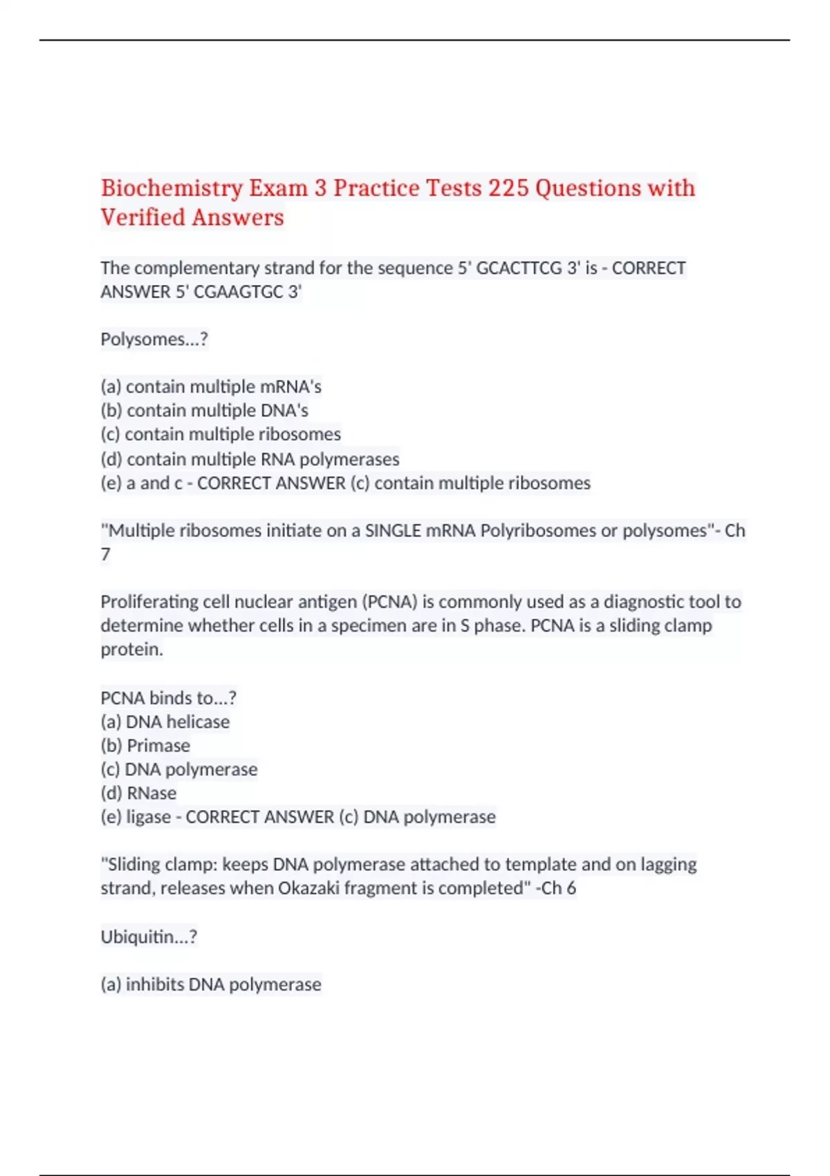Biochemistry Exam 3 Practice Tests 225 Questions with Verified Answers The complementary strand for the sequence 5' GCACTTCG 3' is - CORRECT ANSWER 5' CGAAGTGC 3' Polysomes...? (a) contain multiple mRNA's (b) contain multiple DNA's (c) contain multiple ribosomes (d) contain multiple RNA polymerases (e) a and c - CORRECT ANSWER (c) contain multiple ribosomes "Multiple ribosomes initiate on a SINGLE mRNA Polyribosomes or polysomes"- Ch 7 Proliferating cell nuclear antigen (PCNA) is commonly used as a diagnostic tool to determine whether cells in a specimen are in S phase. PCNA is a sliding clamp protein. PCNA binds to...? (a) DNA helicase (b) Primase (c) DNA polymerase (d) RNase (e) ligase - CORRECT ANSWER (c) DNA polymerase "Sliding clamp: keeps DNA polymerase attached to template and on lagging strand, releases when Okazaki fragment is completed" -Ch 6 Ubiquitin...? (a) inhibits DNA polymerase (b) inhibits RNA polymerase (c) is added to mRNAs (d) is added to proteins (e) decreases expression of the corresponding mRNA - CORRECT ANSWER (d) is added to proteins "Proteins that need to be degraded are marked by covalent modification - attachment of ubiquitin (a small protein - 76AA)" -Ch 7 Which of the following does NOT occur before a eukaryotic mRNA is exported from the nucleus? (a) The ribosome binds to the mRNA. (b) The mRNA is polyadenylated at its 3' end. (c) 7-methyl-G is added in a 5' to 5' linkage to the mRNA. (d) RNA polymerase dissociates. (e) Splicing out of introns in mRNA. - CORRECT ANSWER a) The ribosome binds to the mRNA. Which amino acid would you expect a tRNA with the anticodon 5'-CCA-3' to carry? [Use the genetic code provided in question 16 to answer this question]. (a) proline (b) glycine (c) serine (d) threonine (e) tryptophan - CORRECT ANSWER (e) tryptophan if the tRNA has the anticodon 5'-CCA-3', the mRNA would have the codon 5'-UGG-3' UGG codes for Trp or tryptophan Transcription initiation in eukaryotes requires the coordinated action of many proteins. Which protein is responsible for recruitment of splicing factors to the CTD of RNA Polymerase? (a) snRNP (b) TFIID (c) TBP (d) TFIIH (e) TFIIA - CORRECT ANSWER d) TFIIH miRNA's and siRNA's...? (a) inhibit DNA polymerase (b) inhibit RNA polymerase (c) increase expression of the corresponding mRNA (d) regulate the final step in RNA splicing (e) decrease expression of the corresponding mRNA - CORRECT ANSWER (e) decrease expression of corresponding mRNA. siRNA binds with mRNA and RNA inference is activated and thus mRNA is cleaved. miRNA are involved in transcriptional and post transcriptional regulation of gene expression.. Mutations of the zinc finger protein WT1 cause Wilms' tumor, a pediatric renal tumor. Zinc fingers are typically found in...? (a) methylases and acetylases (b) just acetylases (c) telomerases (d) ribozymes (e) transcription factors - CORRECT ANSWER (e) transcription factors Circle all that applies. Okazaki fragments are...? (a) synthesized by the RNA polymerase (b) composed of RNA and DNA (c) specific to eukaryotes (d) complementary to the leading template strand (e) synthesized from 5' to 3' (f) are about 200 bp long - CORRECT ANSWER (d) complementary to the leading template strand (e) synthesized from 5' to 3' (f) are about 200 bp long 12. Prepare a 5-liter solution of a 10 mM JGP, 10 mM NaCl solution using dry JGP powder (100 g/mol), a 1 M NaCl stock solution and water. JGP: __________ NaCl: ________ Water: _______ - CORRECT ANSWER KNOW HOW TO SOLVE THIS TYPE OF PROBLEM What are the basic steps involved in ribosome assembly on a eukaryotic mRNA? - CORRECT ANSWER UNSURE The two ribosomal subunits come together on an mRNA molecule near its 5' end: -Small subunit matches tRNAs with codons -Large subunit catalyzes formation of peptide bonds Three binding sites: -A site (aminoacyl-tRNA): charged tRNA binds to its codon -P site (peptidyl-tRNA): condensation of amino acids -E site (exit): where the "uncharged" tRNA is ejected You are a nurse in charge of controlling the spread of infectious diseases in a hospital. About 4 weeks ago there was an outbreak of vancomycin-resistant Enterococcus faecium in a surgical oncology ward. This morning you get a report of 4 children in a pediatric ward developing vancomycin-resistant Staphylococcus aureus infections. One of the pediatricians tells you that the pediatricians (none of whom took BIOL 213) have never before seen vancomycinresistant Staphylococcus aureus infections, and they have no idea how this could have happened. Explain what happened, drawing diagrams. - CORRECT ANSWER What is the role of telomerase in the cell? How would deletion of the telomerase gene affect rapidly dividing cells? - CORRECT ANSWER telomerase is a ribonucleoprotein complex that replicate chromosome ends in DNA synthesis (Ch 6) deletion of telomerase leads to telomeres to becoming abnormally short as cells divide. The shortened telomeres likely trigger cells that divide rapidly, such as cells that line the inside of the lungs, to stop dividing or to die prematurely What is a nucleosome (i.e., what are the constituents)? - CORRECT ANSWER 146 bp DNA fragment + 2 H2A, 2 H2B, 2 H3 and 2 H4 (histone octamer) linker DNA connects to DNA wrapped around histones ("beads-on-string") H1 (required for 30 nm fiber packing level) H2A, H2B, H3 and H4 (nucleosome core) look at slide 36? Bacteria don't have nucleosomes Provide two distinct examples that illustrate how nucleosomes regulate molecular functions in the cell. - CORRECT ANSWER Small DNA fragments of ~200bp are synthesized Enzyme? - CORRECT ANSWER DNA polymerase "Extension of the RNA primer by DNA polymerase generates the Okazaki fragment (~200 nt)" The DNA helix is further unzipped enzyme? - CORRECT ANSWER DNA Helicase? ("further?") A short RNA fragment is synthesized to serve as a primer for the replication of the lagging strand template enzyme? - CORRECT ANSWER DNA primase RNA is replaced with DNA enzyme? - CORRECT ANSWER Repair polymeras