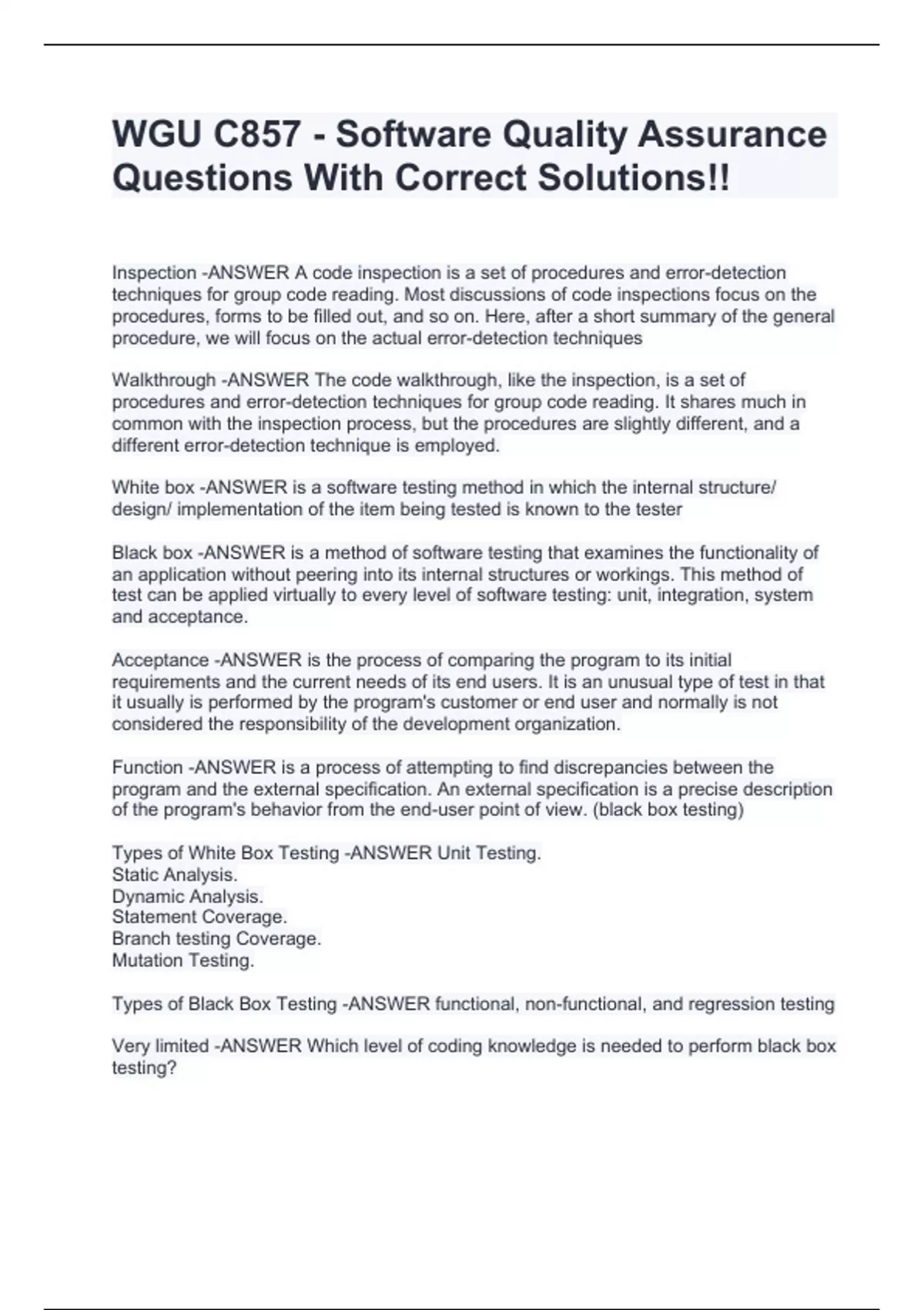 Inspection -ANSWER A code inspection is a set of procedures and error-detection techniques for group code reading. Most discussions of code inspections focus on the procedures, forms to be filled out, and so on. Here, after a short summary of the general procedure, we will focus on the actual error-detection techniques Walkthrough -ANSWER The code walkthrough, like the inspection, is a set of procedures and error-detection techniques for group code reading. It shares much in common with the inspection process, but the procedures are slightly different, and a different error-detection technique is employed. White box -ANSWER is a software testing method in which the internal structure/ design/ implementation of the item being tested is known to the tester Black box -ANSWER is a method of software testing that examines the functionality of an application without peering into its internal structures or workings. This method of test can be applied virtually to every level of software testing: unit, integration, system and acceptance. Acceptance -ANSWER is the process of comparing the program to its initial requirements and the current needs of its end users. It is an unusual type of test in that it usually is performed by the program's customer or end user and normally is not considered the responsibility of the development organization. Function -ANSWER is a process of attempting to find discrepancies between the program and the external specification. An external specification is a precise description of the program's behavior from the end-user point of view. (black box testing) Types of White Box Testing -ANSWER Unit Testing. Static Analysis. Dynamic Analysis. Statement Coverage. Branch testing Coverage. Mutation Testing. Types of Black Box Testing -ANSWER functional, non-functional, and regression testing Very limited -ANSWER Which level of coding knowledge is needed to perform black box testing? System testing -ANSWER has