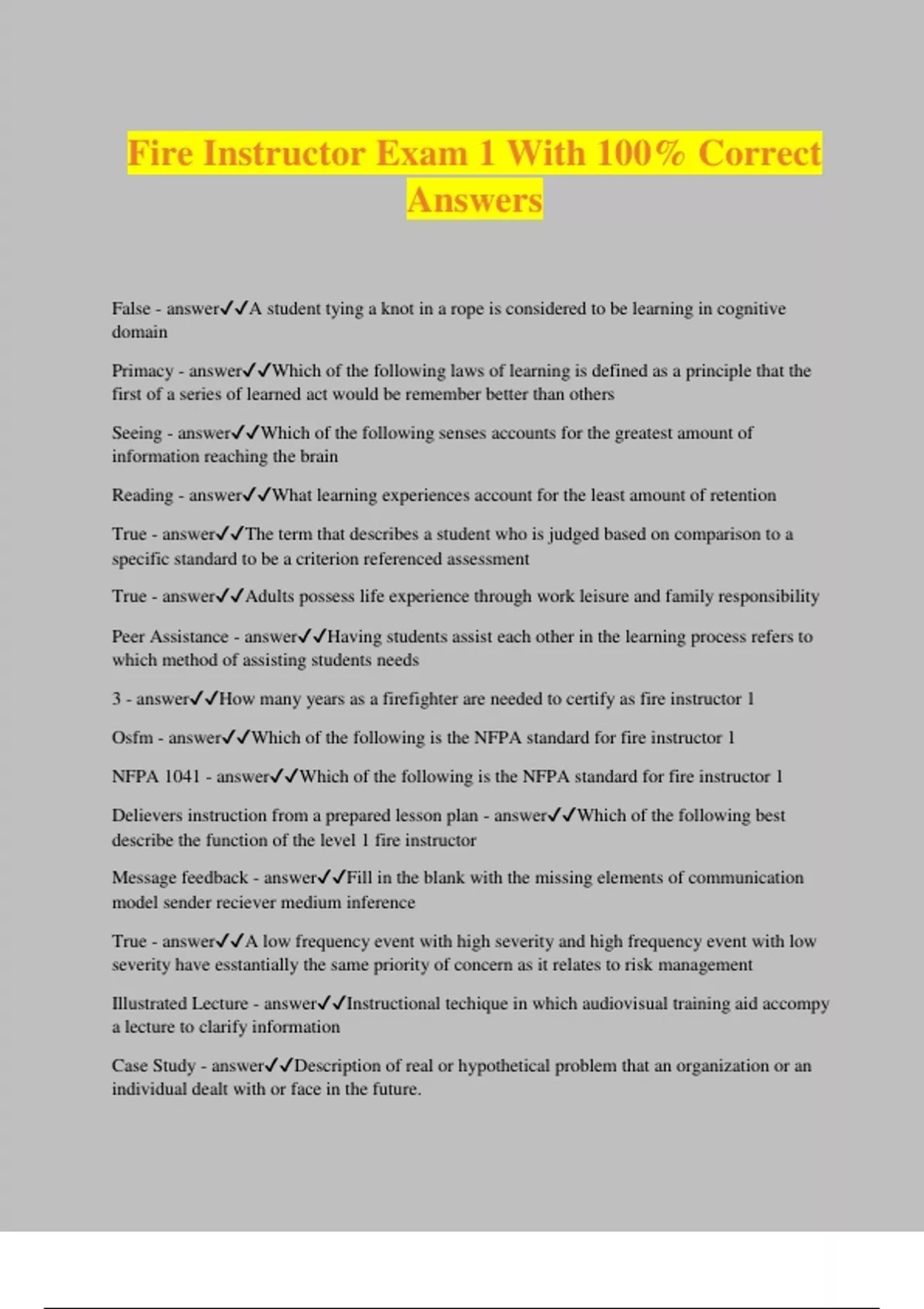 Fire Instructor Exam 1 With 100% Correct Answers False - answerA student tying a knot in a rope is considered to be learning in cognitive domain Primacy - answerWhich of the following laws of learning is defined as a principle that the first of a series of learned act would be remember better than others Seeing - answerWhich of the following senses accounts for the greatest amount of information reaching the brain Reading - answerWhat learning experiences account for the least amount of retention True - answerThe term that describes a student who is judged based on comparison to a specific standard to be a criterion referenced assessment True - answerAdults possess life experience through work leisure and family responsibility Peer Assistance - answerHaving students assist each other in the learning process refers to which method of assisting students needs 3 - answerHow many years as a firefighter are needed to certify as fire instructor 1 Osfm - answerWhich of the following is the NFPA standard for fire instructor 1 NFPA 1041 - answerWhich of the following is the NFPA standard for fire instructor 1 Delievers instruction from a prepared lesson plan - answerWhich of the following best describe the function of the level 1 fire instructor