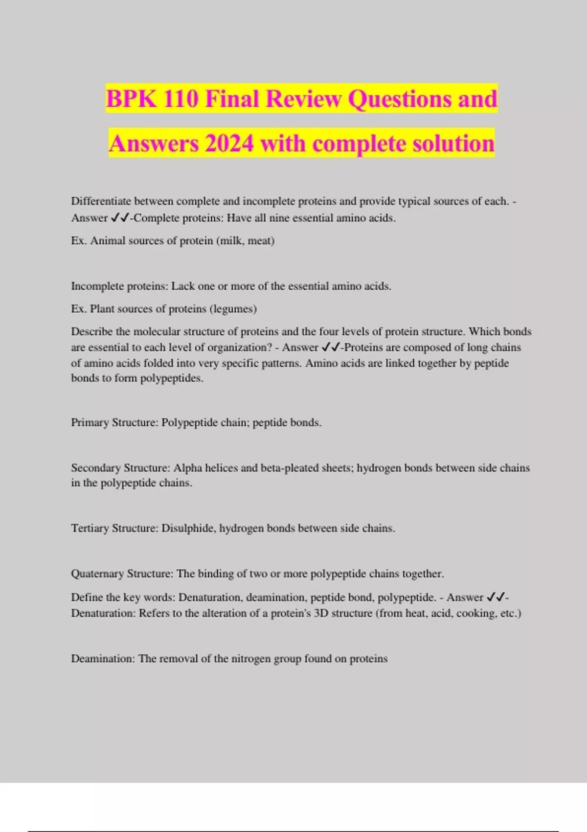 BPK 110 Final Review Questions and Answers 2024 with complete solution Differentiate between complete and incomplete proteins and provide typical sources of each. - Answer ️️ -Complete proteins: Have all nine essential amino acids. Ex. Animal sources of protein (milk, meat) Incomplete proteins: Lack one or more of the essential amino acids. Ex. Plant sources of proteins (legumes) Describe the molecular structure of proteins and the four levels of protein structure. Which bonds are essential to each level of organization? - Answer ️️ -Proteins are composed of long chains of amino acids folded into very specific patterns. Amino acids are linked together by peptide bonds to form polypeptides. Primary Structure: Polypeptide chain; peptide bonds. Secondary Structure: Alpha helices and beta-pleated sheets; hydrogen bonds between side chains in the polypeptide chains. Tertiary Structure: Disulphide, hydrogen bonds between side chains. Quaternary Structure: The binding of two or more polypeptide chains together. Define the key words: Denaturation, deamination, peptide bond, polypeptide. - Answer ️️ - Denaturation: Refers to the alteration of a protein's 3D structure (from heat, acid, cooking, etc.) Deamination: The removal of the nitrogen group found on proteins Where/how does protein digestion occur in the body? Include key enzymes involved in the process and their source organs. - Answer ️️ -1. In the mouth, chewing begins the mechanical breakdown of protein. 2. In the stomach, hydrochloric acid and the enzyme pepsin begin the chemical digestion of protein. 3. In the small intestine, pancreatic proteases (trypsin and chymotrypsin), along with enzymes in the microvilli break down polypeptides into amino acids, dipeptides, and tripeptides. What risk is there in consuming isolates of single amino acids? - Answer ️️ -Similar amino acids sometimes use the same transporter, so if there is an overabundance of one amino acid, it may block the absorption of another (deficiency). Outline the key functions of proteins. Use specific examples. - Answer ️️ -1. Structure: Protein forms some of the base structure of bone, ligaments, muscles, hair, and skin 2. Enzymes: Proteins that speed of the rate of chemical reactions 3. Transport: The hemoglobin protein in blood binds to oxygen and allows it to be transported by red blood cells 4. Protection from disease: Antibodies are proteins that help fight off infection 5. Movement: Actin and myosin are proteins that allow muscles to contract 6. Fluid balance: Proteins found in blood draw in water, reducing chance of edema 7. Energy extraction Differentiate between kwashiorkor and marasmus. - Answer ️️ -Kwashiorkor: Protein deficiency leading to fluid accumulation in the abdomen, and a fatty liver Marasmus: Protein and energy deficiency leading to the depletion of fat stores and wasting of muscle Contrast the potential benefits and risks of consuming a high protein diet. - Answer ️️ - Benefits: -May be associated with weight loss -Can help build muscle mass Risks: -Can lead to dehydration, since deamination requires more water excretion -May increase calcium loss -May increase risk of kidney stones Outline the protein recommendations for the average Canadian, pregnant women and endurance and strength athletes. - Answer ️️ -AMDR: 10-35% of calories RDA: 0.8 g/kg of body weight Pregnant: +25 g/day Endurance/Strength Athletes: 1.2-1.4 g/kg of body weight Explain the concept of protein complementation. - Answer ️️ -Consuming different sources of plant protein that are rich sources of certain essential amino acids, to ensure all the essential amino acids are met. Differentiate between the different types of vegetarian diets. - Answer ️️ -Semivegetarian: Excludes red meat but may include fish, poultry, diary products, and eggs. Pescetarian: Excludes all animal flesh except fish. Lacto-Ovo Vegetarian: Excludes all animal flesh but does include eggs and dairy products such as milk and cheese. Lacto Vegetarian: Excludes animal flesh and eggs but does in