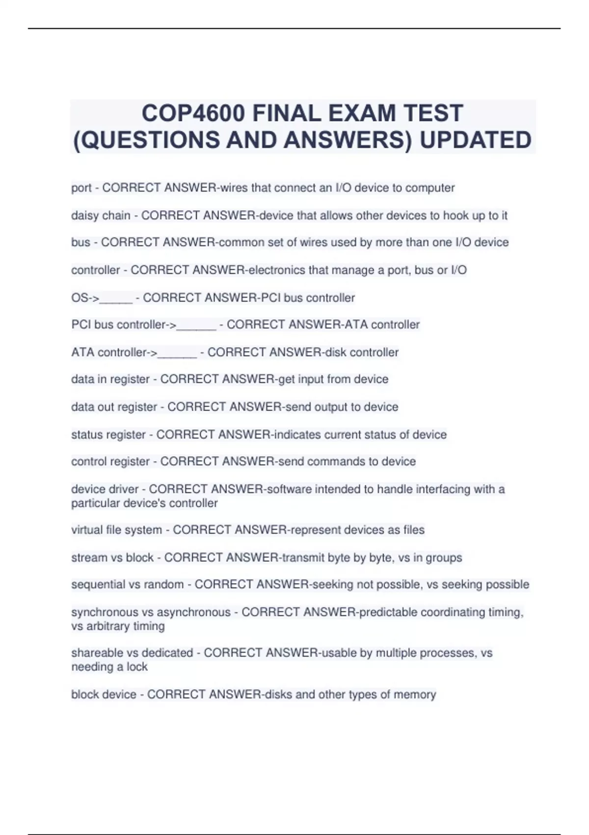 COP4600 FINAL EXAM TEST (QUESTIONS AND ANSWERS) UPDATED port - CORRECT ANSWER-wires that connect an I/O device to computer daisy chain - CORRECT ANSWER-device that allows other devices to hook up to it bus - CORRECT ANSWER-common set of wires used by more than one I/O device controller - CORRECT ANSWER-electronics that manage a port, bus or I/O OS->_____ - CORRECT ANSWER-PCI bus controller PCI bus controller->______ - CORRECT ANSWER-ATA controller ATA controller->______ - CORRECT ANSWER-disk controller data in register - CORRECT ANSWER-get input from device data out register - CORRECT ANSWER-send output to device status register - CORRECT ANSWER-indicates current status of device control register - CORRECT ANSWER-send commands to device device driver - CORRECT ANSWER-software intended to handle interfacing with a particular device's controller virtual file system - CORRECT ANSWER-represent devices as files stream vs block - CORRECT ANSWER-transmit byte by byte, vs in groups sequential vs random - CORRECT ANSWER-seeking not possible, vs seeking possible synchronous vs asynchronous - CORRECT ANSWER-predictable coordinating timing, vs arbitrary timing shareable vs dedicated - CORRECT ANSWER-usable by multiple processes, vs needing a lock block device - CORRECT ANSWER-disks and other types of memory read, write, seek stream device - CORRECT ANSWER-generate linear input/output of data get, put clocks - CORRECT ANSWER-preempt processes, flush cache buffers, report timeouts device status table - CORRECT ANSWER-keep track of each device and related pending requests double buffering - CORRECT ANSWER-switch buffers as they fill useful with slow producer and fast consumer spool - CORRECT ANSWER-special purpose buffer that serves jobs magnetic disks - CORRECT ANSWER-made of series of platters read-write heads float above platters, attached to a disk arm platter->_____ - CORRECT ANSWER-tracks tracks->_____ - CORRECT ANSWER-sectors cylinder - CORRECT ANSWER-collection of tracks at same distance from center transfer rate - CORRECT ANSWER-effective rate of data flow between disk and computer random access time - CORRECT ANSWER-seek time plus rotational latency seek time - CORRECT ANSWER-time taken to move disk arm to right cylinder rotational latency - CORRECT ANSWER-time taken for right sector to rotate to the disk head Solid State Drive - CORRECT ANSWER-use memory controllers far faster random access times ATA for ______ - CORRECT ANSWER-HDD/SDD PCI-Express for _____ - CORRECT ANSWER-high end SSD USB for _____ - CORRECT ANSWER-low end external memory Thunderbolt for _____ - CORRECT ANSWER-high end external memory
