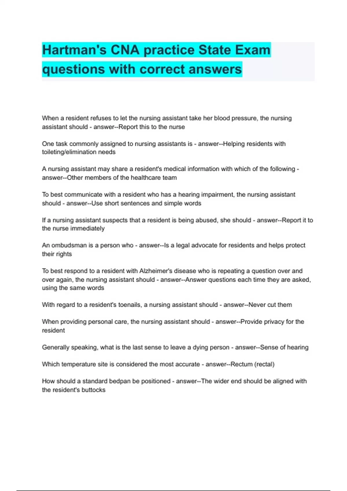 - Hartman\'s CNA practice State Exa qustions with c