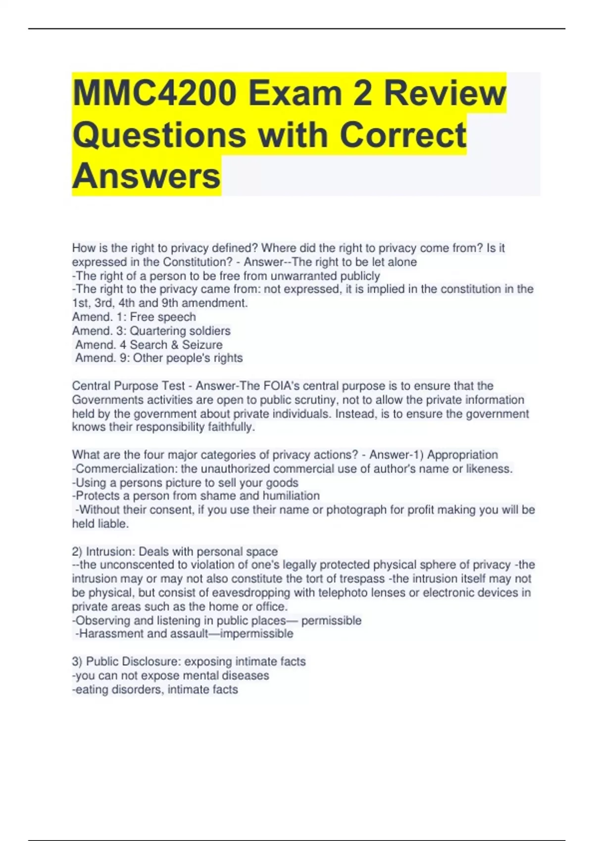 MMC4200 Exam 2 Review Questions with Correct Answers How is the right to privacy defined? Where did the right to privacy come from? Is it expressed in the Constitution? - Answer--The right to be let alone -The right of a person to be free from unwarranted publicly -The right to the privacy came from: not expressed, it is implied in the constitution in the 1st, 3rd, 4th and 9th amendment. Amend. 1: Free speech Amend. 3: Quartering soldiers Amend. 4 Search & Seizure Amend. 9: Other people's rights Central Purpose Test - Answer-The FOIA's central purpose is to ensure that the Governments activities are open to public scrutiny, not to allow the private information held by the government about private individuals. Instead, is to ensure the government knows their responsibility faithfully. What are the four major categories of privacy actions? - Answer-1) Appropriation -Commercialization: the unauthorized commercial use of author's name or likeness. -Using a persons picture to sell your goods -Protects a person from shame and humiliation -Without their consent, if you use their name or photograph for profit making you will be held liable. 2) Intrusion: Deals with personal space --the unconscented to violation of one's legally protected physical sphere of privacy -the intrusion may or may not also constitute the tort of trespass -the intrusion itself may not be physical, but consist of eavesdropping with telephoto lenses or electronic devices in private areas such as the home or office. -Observing and listening in public places— permissible -Harassment and assault—impermissible 3) Public Disclosure: exposing intimate facts -you can not expose mental diseases -eating disorders, intimate facts 4) Portrayal/False Light -disclosing false facts about someone with prior knowledge of falsity (aka rumors) Three categories What must a plaintiff prove in a private-facts suit? What defenses can the media use in lawsuits over publication of private facts? - Answer-Would be high offensive to a reasonable person, and is not of legitimate concern to the public (not newsworthy) Generally must also have widespread dissemination Where do people generally have the greatest expectation of privacy? The least? - Answer-People have the greatest expectation of privacy at home and the least in the public. The least expectation of privacy is informational. This includes data privace in medical data, credit history, banking data, purchasing history Which constitutional provision is related to intrusion? - Answer-4th Amendment: Thirdparty monitoring: Government can not illegally wiretap, bug, eavesdrop Is tape-recording a conversation without the knowledge of one of the parties legal? - Answer-Participant monitoring: when at least one party to conversation knows it is being recorded -Federal law and most states permit so long as recording not used for criminal purposes -Florida does not permit taping calls -Journalists gave fakes names, gained acces to doctor's home and recorded with hidden cameras. What must a plaintiff prove in a false-light privacy case? What defenses can the media use in false-light cases? - Answer-Plaintiff must claim he is victim of falsehood. Actual malice - media believes false light claims are harder to prove. What are the two broad categories that constitute "highly offensive publications"? . - Answer-Embellishment - most common; the media limits info/ uses it out of context to portray false impression Fictionalizing - adding fictional dialogue characters to what amounts to factual work ( ex. Time Inc v. Hill case) In false-light cases, does it matter that the plaintiff is a public figure? Does it matter in appropriation cases? - Answer-In false light cases all plaintiffs must prove actual malice whether or not they are public figures. In appropriation cases, however the status of the plaintiff does matter .