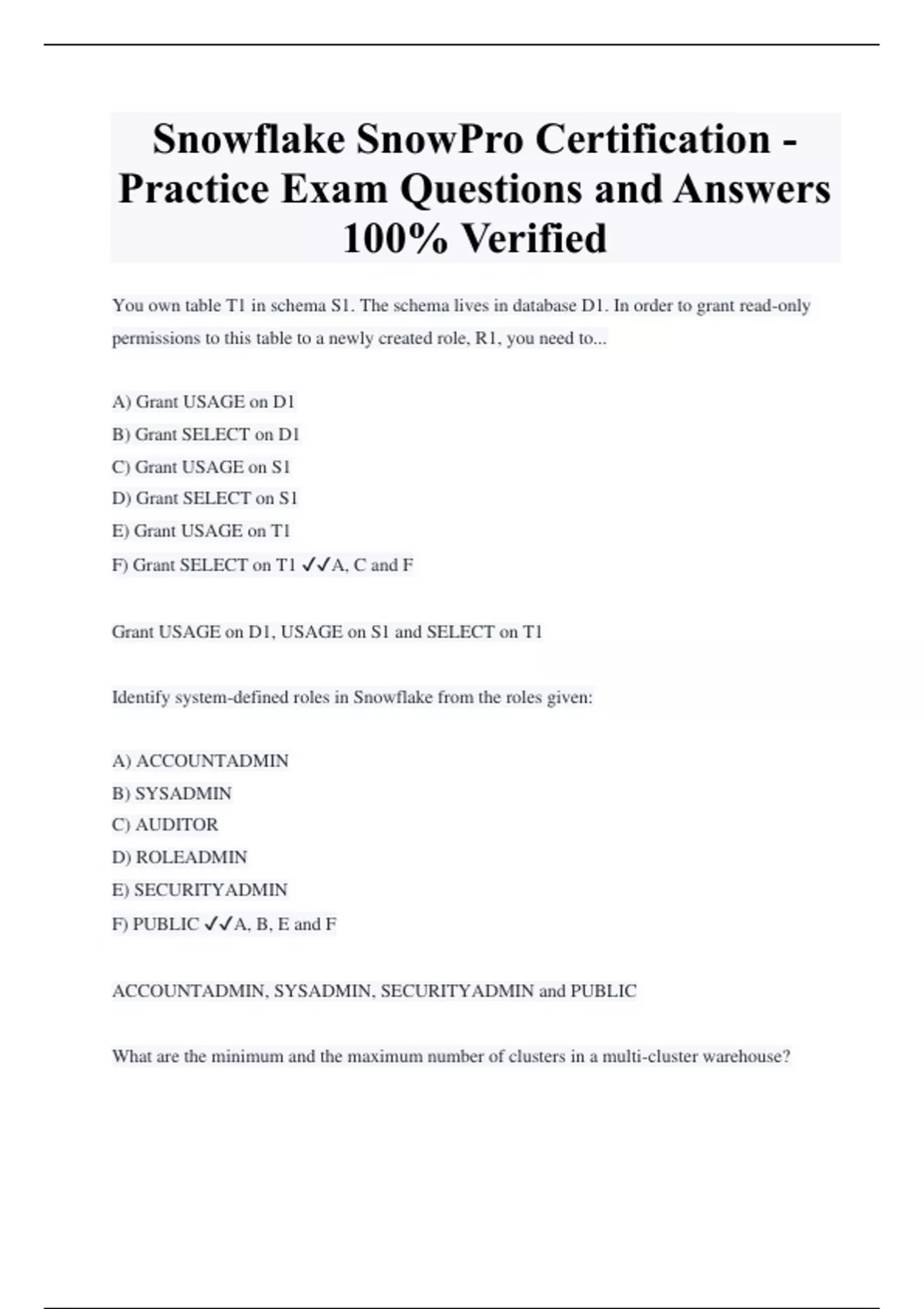 Snowflake SnowPro Certification - Practice Exam Questions and Answers 100% Verified You own table T1 in schema S1. The schema lives in database D1. In order to grant read-only permissions to this table to a newly created role, R1, you need to... A) Grant USAGE on D1 B) Grant SELECT on D1 C) Grant USAGE on S1 D) Grant SELECT on S1 E) Grant USAGE on T1 F) Grant SELECT on T1 A, C and F Grant USAGE on D1, USAGE on S1 and SELECT on T1 Identify system-defined roles in Snowflake from the roles given: A) ACCOUNTADMIN B) SYSADMIN C) AUDITOR D) ROLEADMIN E) SECURITYADMIN F) PUBLIC A, B, E and F ACCOUNTADMIN, SYSADMIN, SECURITYADMIN and PUBLIC What are the minimum and the maximum number of clusters in a multi-cluster warehouse