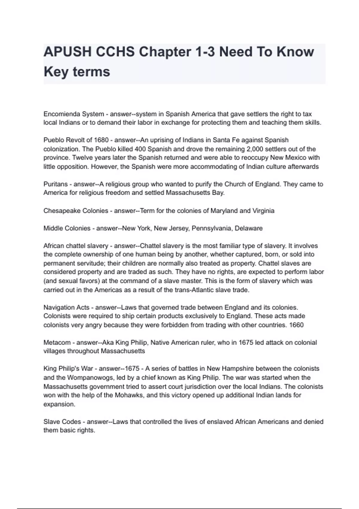 APUSH CCHS Chapter 1-3 Need To Know Key terms with complete solution Encomienda System - answer--system in Spanish America that gave settlers the right to tax local Indians or to demand their labor in exchange for protecting them and teaching them skills. Pueblo Revolt of 1680 - answer--An uprising of Indians in Santa Fe against Spanish colonization. The Pueblo killed 400 Spanish and drove the remaining 2,000 settlers out of the province. Twelve years later the Spanish returned and were able to reoccupy New Mexico with little opposition. However, the Spanish were more accommodating of Indian culture afterwards Puritans - answer--A religious group who wanted to purify the Church of England. They came to America for religious freedom and settled Massachusetts Bay. Chesapeake Colonies - answer--Term for the colonies of Maryland and Virginia Middle Colonies - answer--New York, New Jersey, Pennsylvania, Delaware African chattel slavery - answer--Chattel slavery is the most familiar type of slavery. It involves the complete ownership of one human being by another, whether captured, born, or sold into permanent servitude; their children are normally also treated as property. Chattel slaves are considered property and are traded as such. They have no rights, are expected to perform labor (and sexual favors) at t