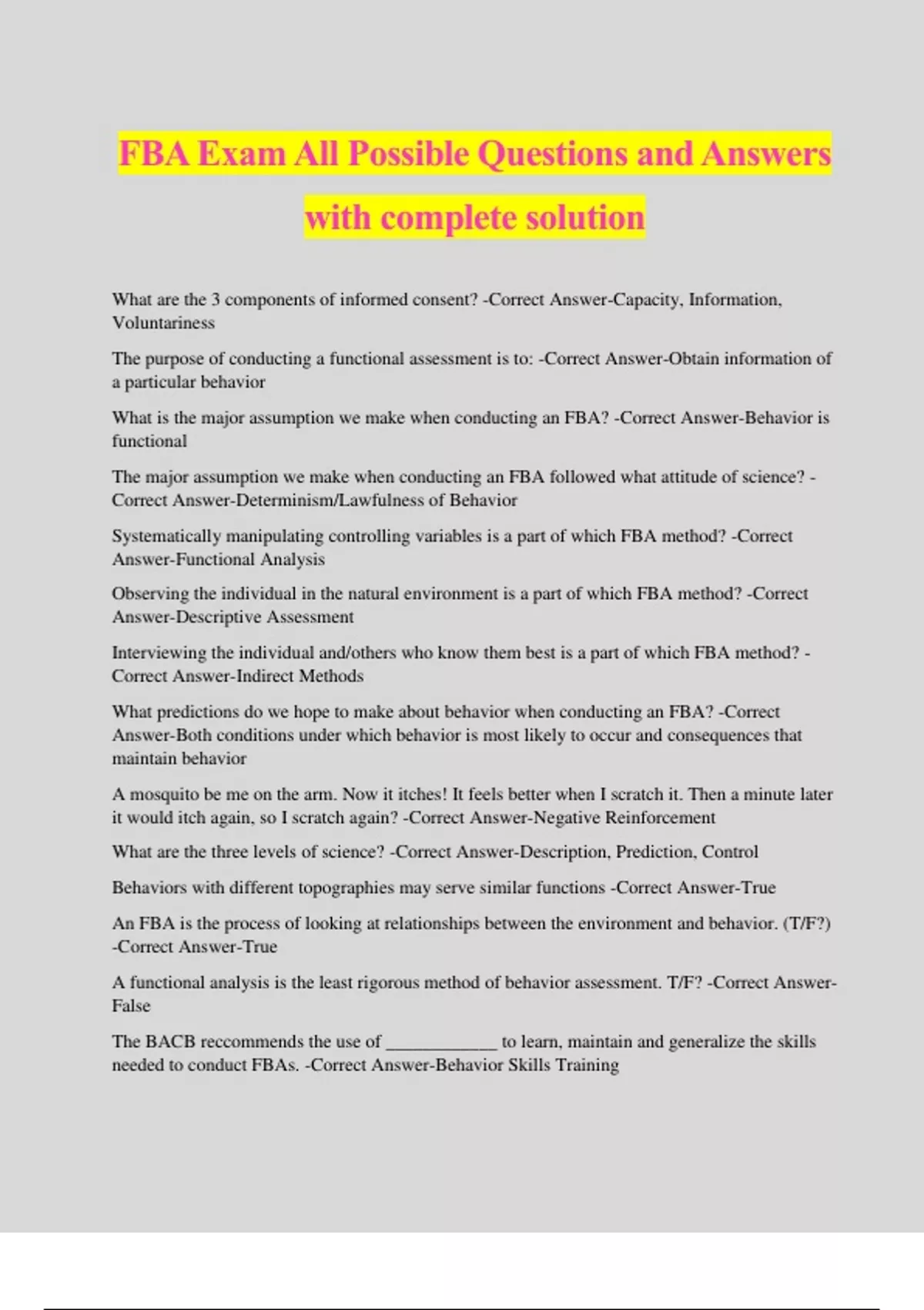FBA Exam All Possible Questions and Answers with complete solution What are the 3 components of informed consent? -Correct Answer-Capacity, Information, Voluntariness The purpose of conducting a functional assessment is to: -Correct Answer-Obtain information of a particular behavior What is the major assumption we make when conducting an FBA? -Correct Answer-Behavior is functional The major assumption we make when conducting an FBA followed what attitude of science? - Correct Answer-Determinism/Lawfulness of Behavior Systematically manipulating controlling variables is a part of which FBA method? -Correct Answer-Functional Analysis Observing the individual in the natural environment is a part of which FBA method? -Correct Answer-Descriptive Assessment Interviewing the individual and/others who know them best is a part of which FBA method? - Correct Answer-Indirect Methods What predictions do we hope to make about behavior when conducting an FBA? -Correct Answer-Both conditions under which behavior is most likely to occur and consequences that maintain behavior A mosquito be me on the arm. Now it itches! It feels better when I scratch it. Then a minute later it would itch again, so I scratch again? -Correct Answer-Negative Reinforcement What are the three levels of science? -Correct Answer-Description, Prediction, Control Behaviors with different topographies may serve similar functions -Correct Answer-True An FBA is the process of looking at relationships between the environment and behavior. (T/F?) -Correct Answer-True A functional analysis is the least rigorous method of behavior assessment. T/F? -Correct Answer- False The BACB reccommends the use of ____________ to learn, maintain and generalize the skills needed to conduct FBAs. -Correct Answer-Behavior Skills Training The goal of a good FBA is to bring ___________ and __________ to otherwise chaotic and confusing situations. -Correct Answer-Clarity and Understanding It is acceptable for practitioners to conduct an FBA independently after attending a two-day workshop on the topic. T/F? -Correct Answer-False Behaviors that directly terminate aversive stimulation are maintained by __________ -Correct Answer-Automatic Negative Reinforcement Current FBA research focuses on ____ of the behaviors and no the _______ -Correct Answer- Function and not the form Jenny is a surrogate for her sister, Claudia. Claudia's group home facilitator wants to implement an overcorrection procedure because she keeps dumping out her dresser drawers. Jenny has signed consent for the procedure but Claudia keeps yelling that she doesn't want to do it when the staff tries to implement it. What is the next step? -Correct Answer-They must discontinue the procedure. Procedure when a neutral stimulus is presented with an unconditioned stimulus until that neutral stimulus becomes a conditioned stimulus that elicits the conditioned response- -Correct Answer- Respondent Conditioning The process of altering the frequency and/or strength of behavior through consequences -Correct Answer-Operant Conditioning A group of stimulu sharing common elements -Correct Answer-Stimulus Class A group of responses with the same function -Correct Answer-Response Class Statements that describe the occurrence of phenomena under study as a function of specific variables -Correct Answer-Functional Relati