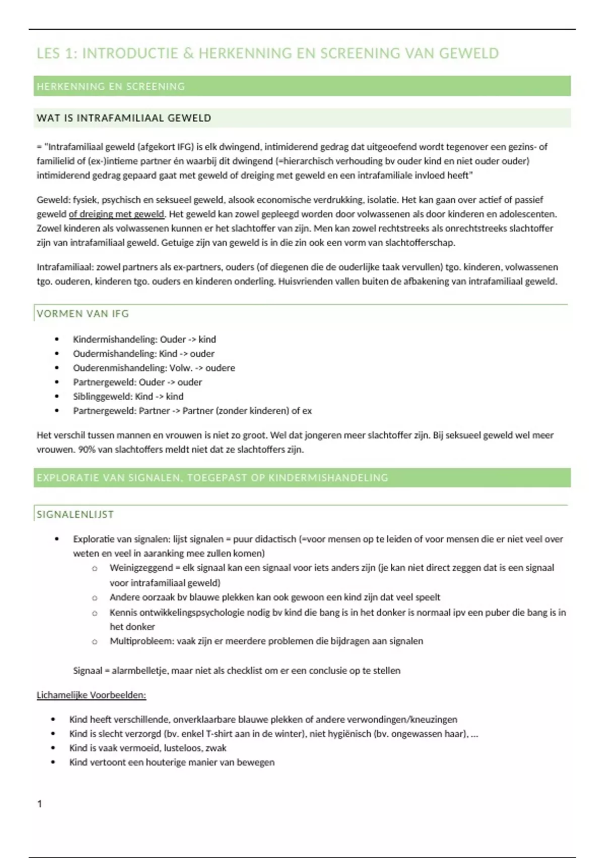 In dit document staat alles wat je moet kennen voor het vak Intrafamiliaal geweld. (Slides, notities, casussen, teksten)