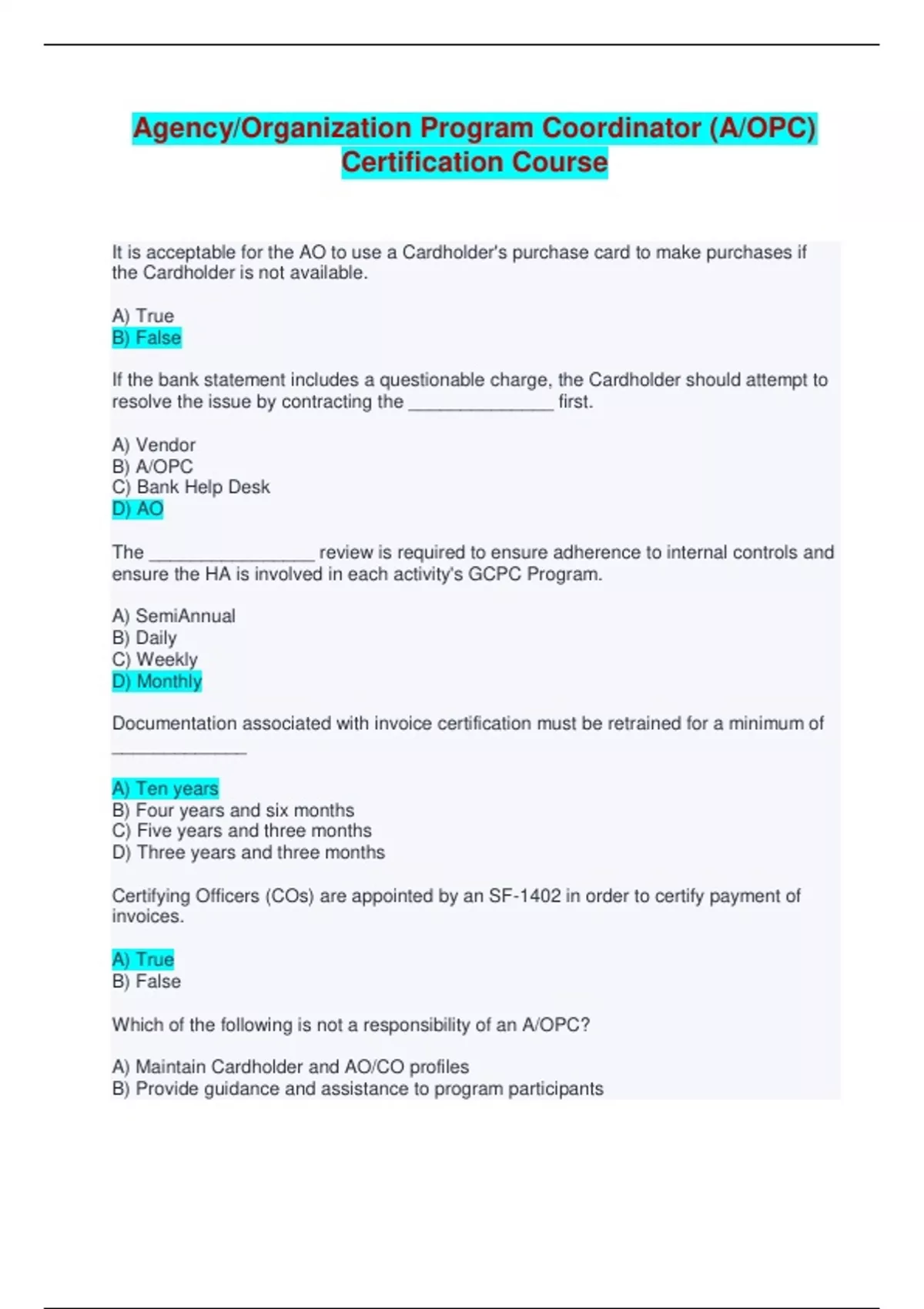 Agency/Organization Program Coordinator (A/OPC) Certification Course It is acceptable for the AO to use a Cardholder's purchase card to make purchases if the Cardholder is not available. A) True B) False If the bank statement includes a questionable charge, the Cardholder should attempt to resolve the issue by contracting the ______________ first. A) Vendor B) A/OPC C) Bank Help Desk D) AO The ________________ review is required to ensure adherence to internal controls and ensure the HA is involved in each activity's GCPC Program. A) SemiAnnual B) Daily C) Weekly D) Monthly Documentation associated with invoice certification must be retrained for a minimum of _____________ A) Ten years B) Four years and six months C) Five years and three months D) Three years and three months Certifying Officers (COs) are appointed by an SF-1402 in order to certify payment of invoices. A) True B) False Which of the following is not a responsibility of an A/OPC? A) Maintain Cardholder and AO/CO profiles B) Provide guidance and assistance to program participants C) Monitor inactive accounts D) Certify the AO statement for payment _________________ who receive information indicating an employee has engaged in potential fraud, misuse or abuse of a GCPC shall take appropriate disciplinary action. A) Program Managers B) Approving Officials C) Head of Activity D) Supervisors