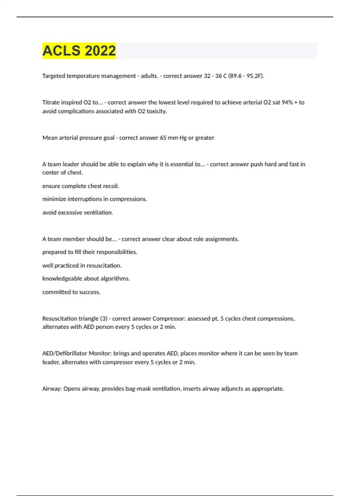 ACLS Advanced Cardiovascular Life Support EXAM STUDY GUIDE 2024 Targeted temperature management - adults. - correct answer 32 - 36 C (89.6 - 95.2F). Titrate inspired O2 to... - correct answer the lowest level required to achieve arterial O2 sat 94% + to avoid complications associated with O2 toxicity. Mean arterial pressure goal - correct answer 65 mm Hg or greater A team leader should be able to explain why it is essential to... - correct answer push hard and fast in center of chest. ensure complete chest recoil. minimize interruptions in compressions. avoid excessive ventilation. A team member should be... - correct answer clear about role assignments. prepared to fill their responsibilities. well practiced in resuscitation. knowledgeable about algorithms