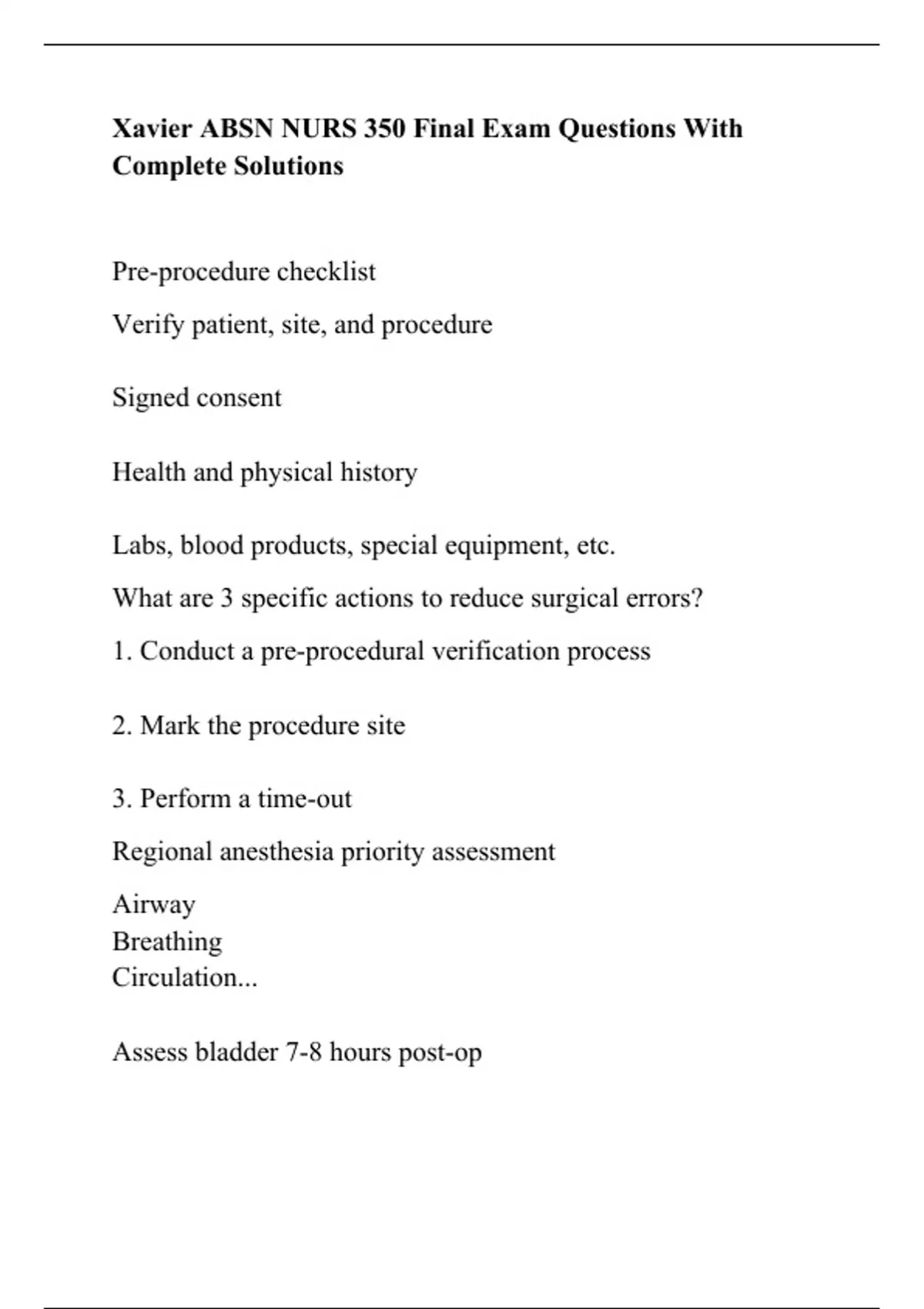 Xavier ABSN NURS 350 Final Exam Questions With Complete Solutions