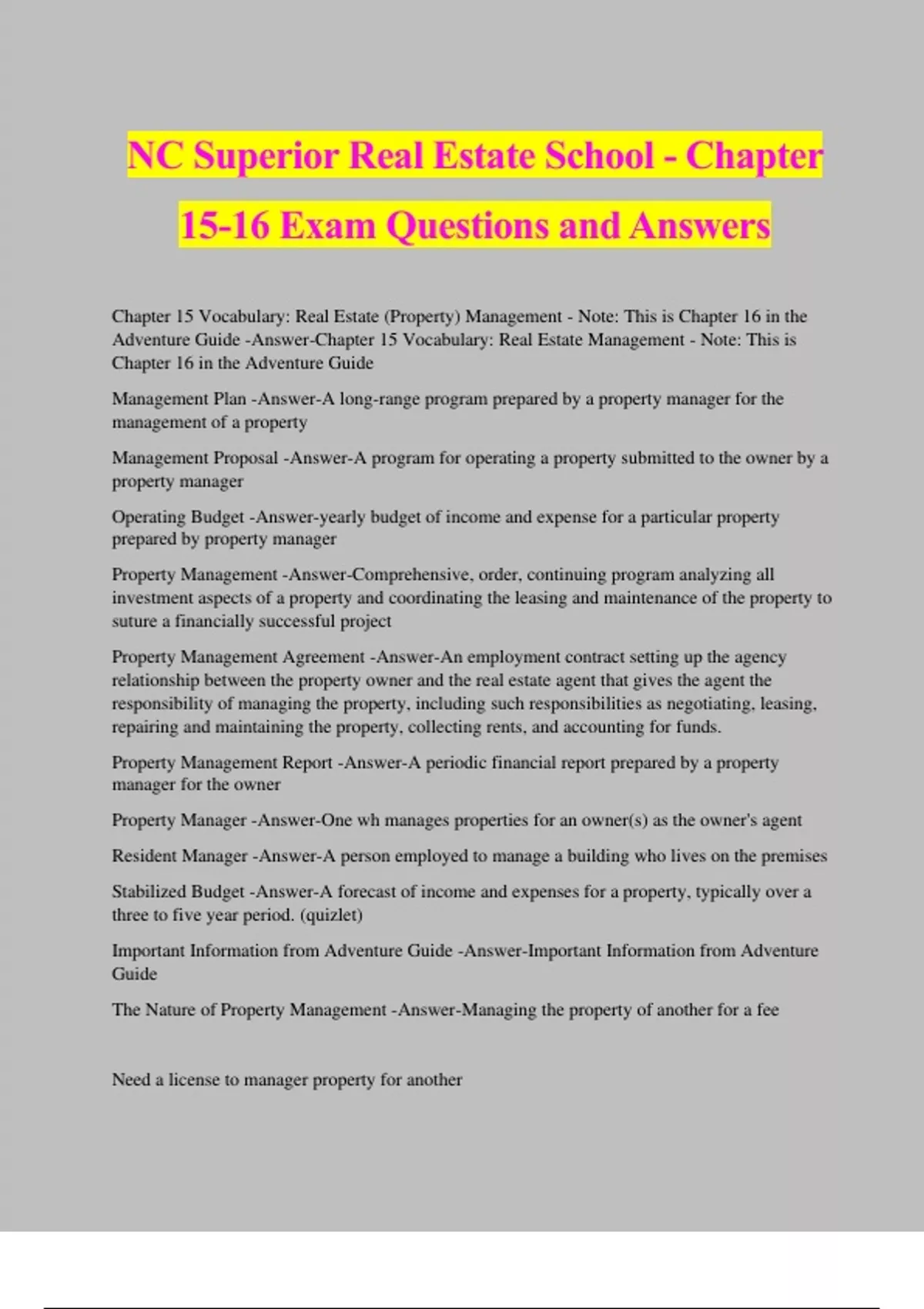 NC Superior Real Estate School - Chapter 15-16 Exam Questions and Answers Chapter 15 Vocabulary: Real Estate (Property) Management - Note: This is Chapter 16 in the Adventure Guide -Answer-Chapter 15 Vocabulary: Real Estate Management - Note: This is Chapter 16 in the Adventure Guide Management Plan -Answer-A long-range program prepared by a property manager for the management of a property Management Proposal -Answer-A program for operating a property submitted to the owner by a property manager Operating Budget -Answer-yearly budget of income and expense for a particular property prepared by property manager Property Management -Answer-Comprehensive, order, continuing program analyzing all investment aspects of a property and coordinating the leasing and maintenance of the property to suture a financially successful project Property Management Agreement -Answer-An employment contract setting up the agency relationship between the property owner and the real estate agent that gives the agent the responsibility of managing the property, including such responsibilities as negotiating, leasing, repairing and maintaining the property, collecting rents, and accounting for funds. Property Management Report -Answer-A periodic financial report prepared by a property manager for the owner Property Manager -Answer-One wh manages properties for an owner(s) as the owner's agent Resident Manager -Answer-A person employed to manage a building who lives on the premises Stabilized Budget -Answer-A forecast of income and expenses for a property, typically over a three to five year period. (quizlet) Important Information from Adventure Guide -Answer-Important Information from Adventure Guide The Nature of Property Management -Answer-Managing the property of another for a fee Need a license to manager property for another The property manager is the firm The licensees work for the property manager Listing agent/buyer's broker agent = firm Exceptions to License Requirements -Answer-Employees of an entity managing its own property Unlicensed salaried employees - can collect rents, show properties, provide information, complete forms - cannot negotiate lease amounts or contract terms or amounts to be paid can do almost anything that the owner can - no compensation (i.e. bonus) unlicensed assistants can not negotiate prices attorneys can show rental properties, no properties for sale No license required to manage an HOA Homeowner's Associations The Property Management Agreem