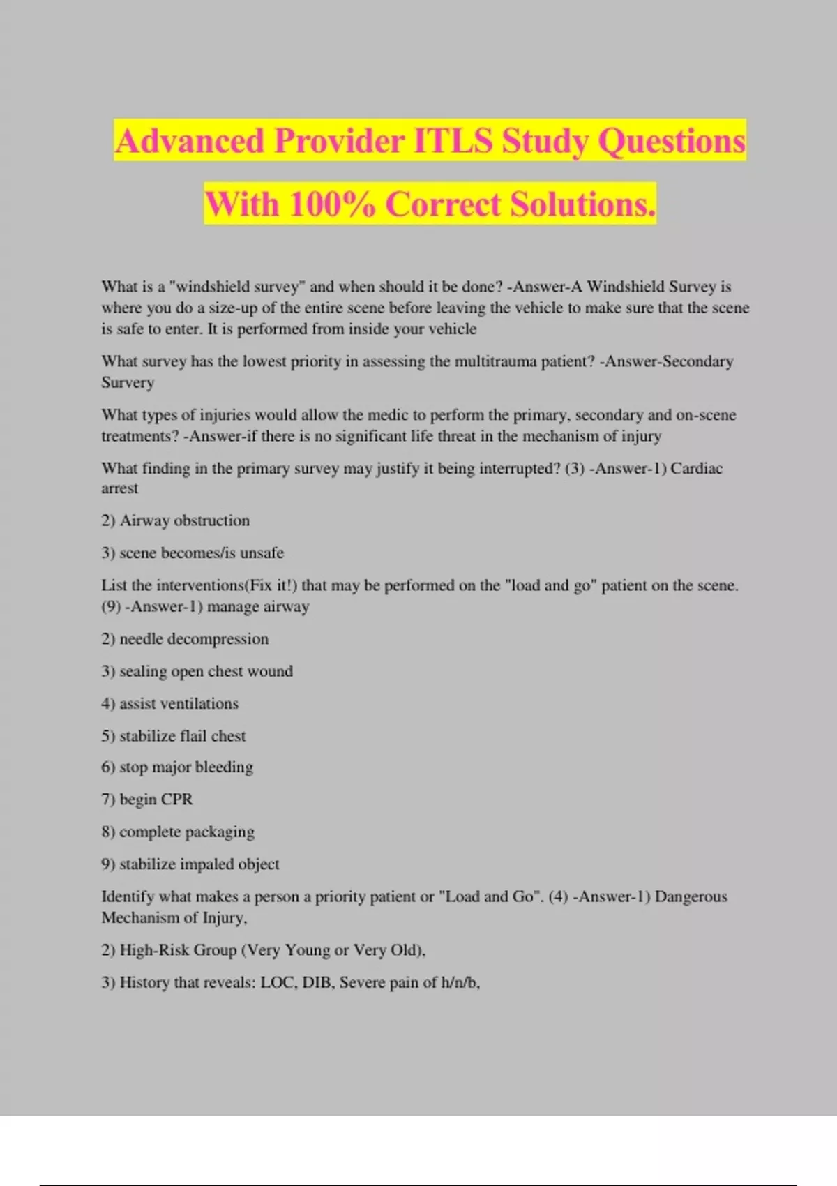 Advanced Provider ITLS Study Questions With 100% Correct Solutions.