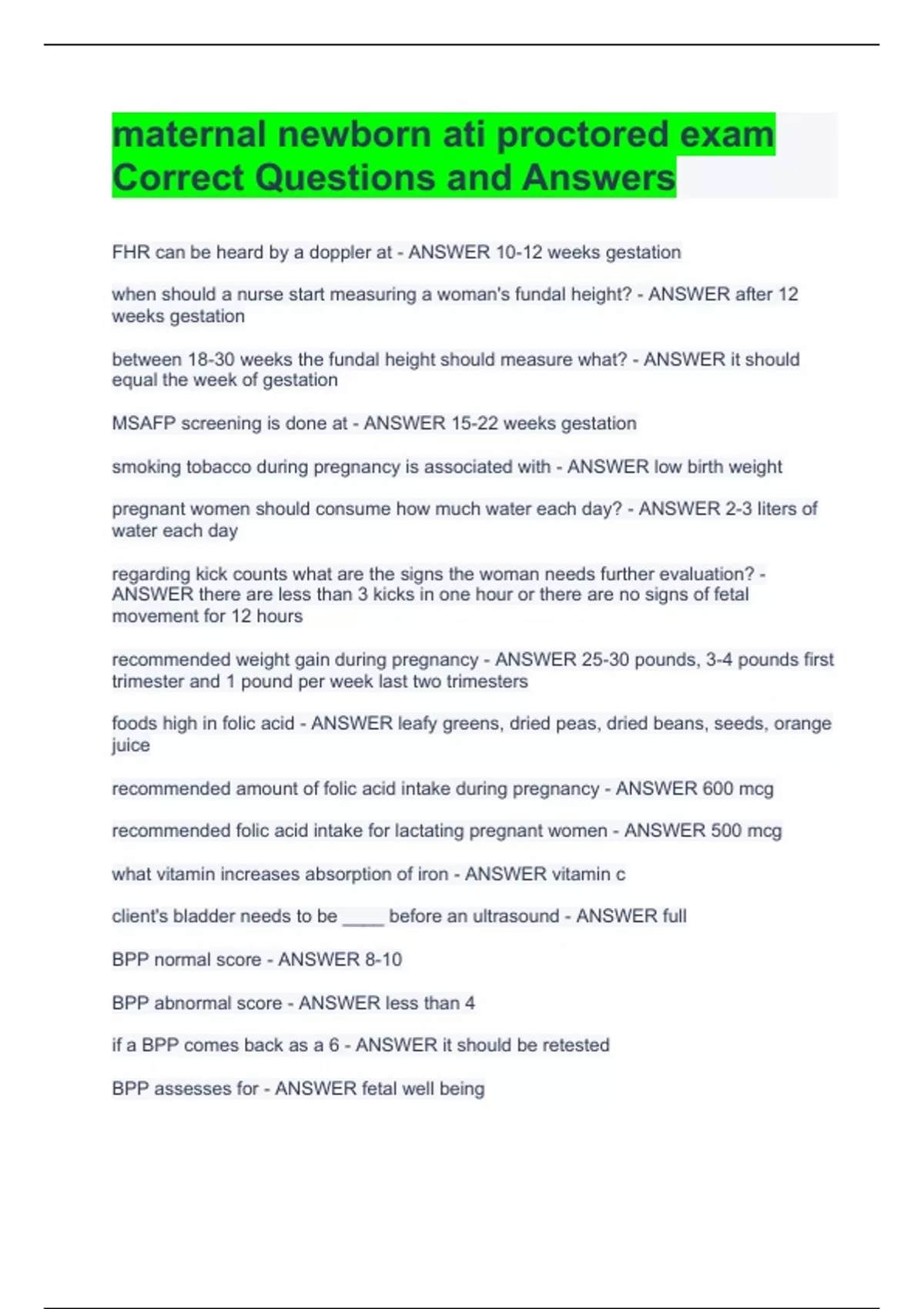 maternal newborn ati proctored exam CorreFHR can be heard by a doppler at - ANSWER 10-12 weeks gestation when should a nurse start measuring a woman's fundal height? - ANSWER after 12 weeks gestation between 18-30 weeks the fundal height should measure what? - ANSWER it should equal the week of gestation MSAFP screening is done at - ANSWER 15-22 weeks gestation smoking tobacco during pregnancy is associated with - ANSWER low birth weight pregnant women should consume how much water each day? - ANSWER 2-3 liters of water each day regarding kick counts what are the signs the woman needs further evaluation? - ANSWER there are less than 3 kicks in one hour or there are no signs of fetal movement for 12 hours recommended weight gain during pregnancy - ANSWER 25-30 pounds, 3-4 pounds first trimester and 1 pound per week last two trimesters foods high in folic acid - ANSWER leafy greens, dried peas, dried beans, seeds, orange juice recommended amount of folic acid intake during pregnancy - ANSWER 600 mcg recommended folic acid intake for lactating pregnant women - ANSWER 500 mcg what vitamin increases absorption of iron - ANSWER vitamin c client's bladder needs to be ____ before an ultrasound - ANSWER full BPP normal score - ANSWER 8-10 BPP abnormal score - ANSWER less than 4 if a BPP comes back as a 6 - ANSWER it should be retested BPP assesses for - ANSWER fetal well being non stress test (NST) - ANSWER assesses fetal well being during third trimester reactive NST - ANSWER normal FHR baseline with moderate variability and two accelerations 15 beats per minute for at least 15 seconds over 20 minute period non reactive NST indicates - ANSWER FHR did not accelerate adequately with fetal ct Questions and Answers