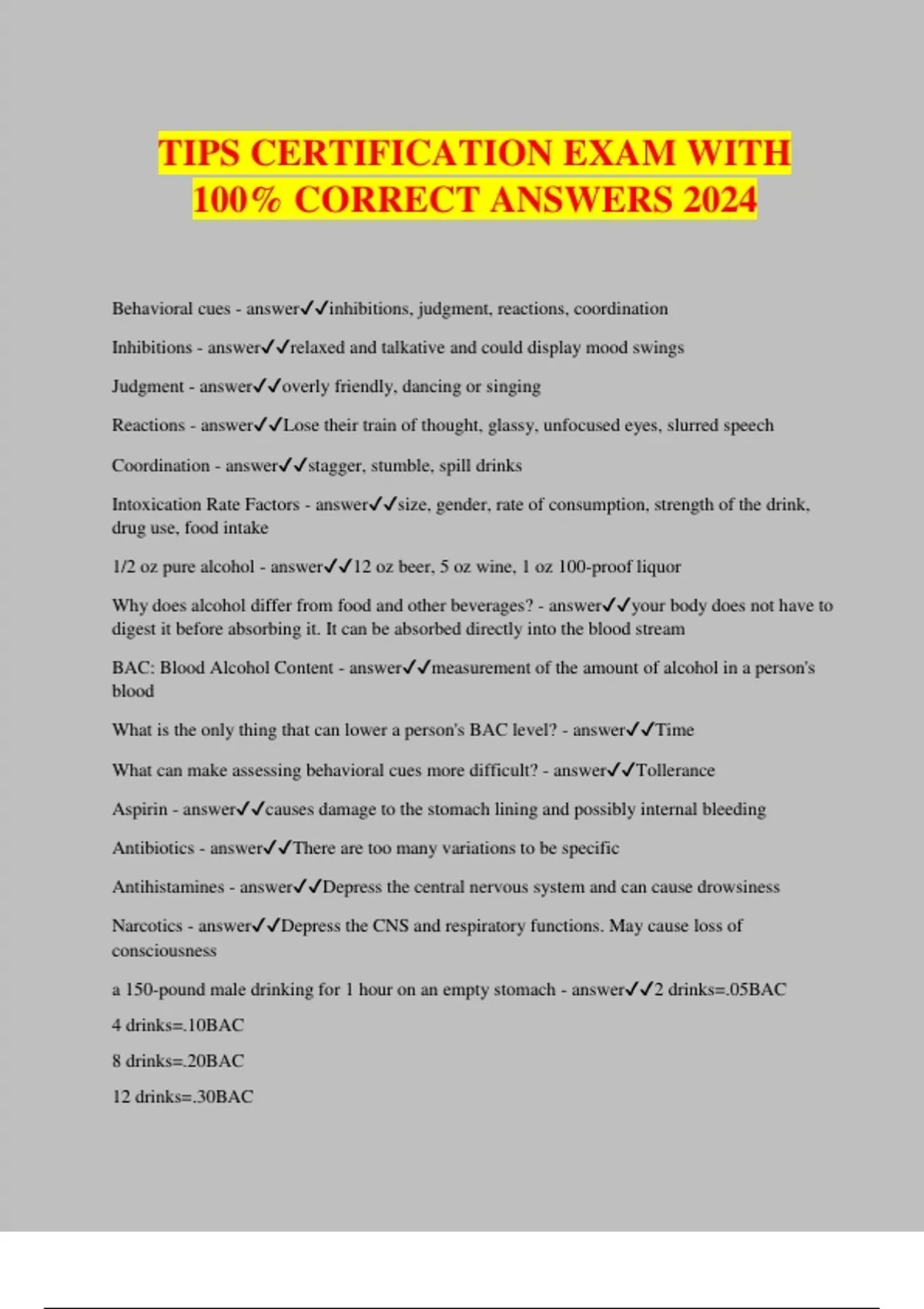 TIPS CERTIFICATION EXAM WITH 100% CORRECT ANSWERS 2024 Behavioral cues - answerinhibitions, judgment, reactions, coordination Inhibitions - answerrelaxed and talkative and could display mood swings Judgment - answeroverly friendly, dancing or singing Reactions - answerLose their train of thought, glassy, unfocused eyes, slurred speech Coordination - answerstagger, stumble, spill drinks Intoxication Rate Factors - answersize, gender, rate of consumption, strength of the drink, drug use, food intake 1/2 oz pure alcohol - answer12 oz beer, 5 oz wine, 1 oz 100-proof liquor Why does alcohol differ from food and other beverages? - answeryour body does not have to digest it before absorbing it. It can be absorbed directly into the blood stream