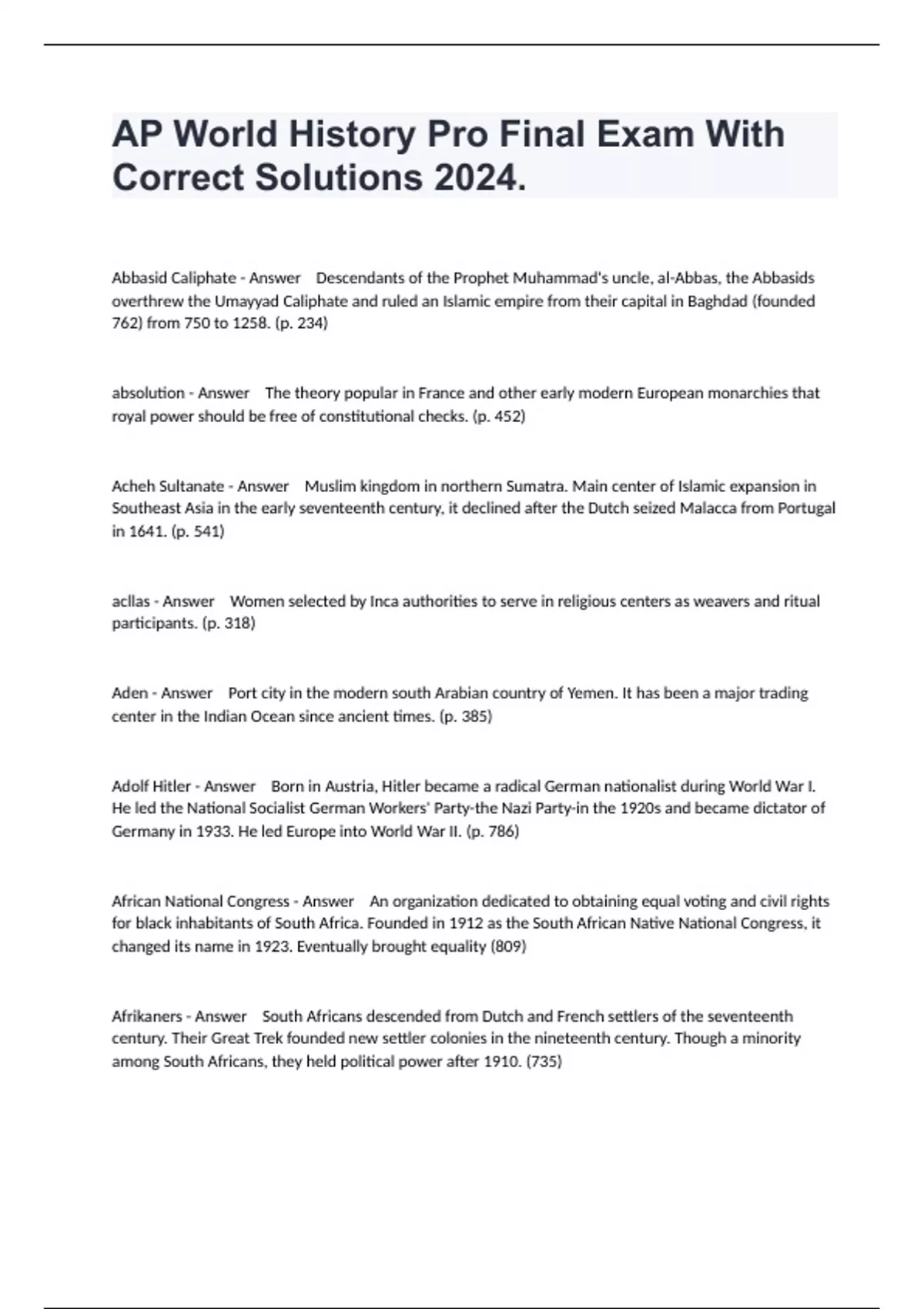Abbasid Caliphate - Answer Descendants of the Prophet Muhammad's uncle, al-Abbas, the Abbasids overthrew the Umayyad Caliphate and ruled an Islamic empire from their capital in Baghdad (founded 762) from 750 to 1258. (p. 234) absolution - Answer The theory popular in France and other early modern European monarchies that royal power should be free of constitutional checks. (p. 452) Acheh Sultanate - Answer Muslim kingdom in northern Sumatra. Main center of Islamic expansion in Southeast Asia in the early seventeenth century, it declined after the Dutch seized Malacca from Portugal in 1641. (p. 541) acllas - Answer Women selected by Inca authorities to serve in religious centers as weavers and ritual participants. (p. 318) Aden - Answer Port city in the modern south Arabian country of Yemen. It has been a major trading center in the Indian Ocean since ancient times. (p. 385) Adolf Hitler - Answer Born in Austria, Hitler became a radical German nationalist during World War I. He led the National Socialist German Workers' Party-the Nazi Party-in the 1920s and became dictator of Germany in 1933. He led Europe into World War II. (p. 786) African National Congress - Answer An organization dedicated to obtaining equal voting and civil rights for black inhabitants of South Africa. Founded in 1912 as the South African Native National Congress, it changed its name in 1923. Eventually brought equality (809) Afrikaners - Answer South Africans descended from Dutch and French settlers of the seventeenth century. Their Great Trek founded new settler colonies in the nineteenth century. Though a minority among South Africans, they held political power after 1910. (735)