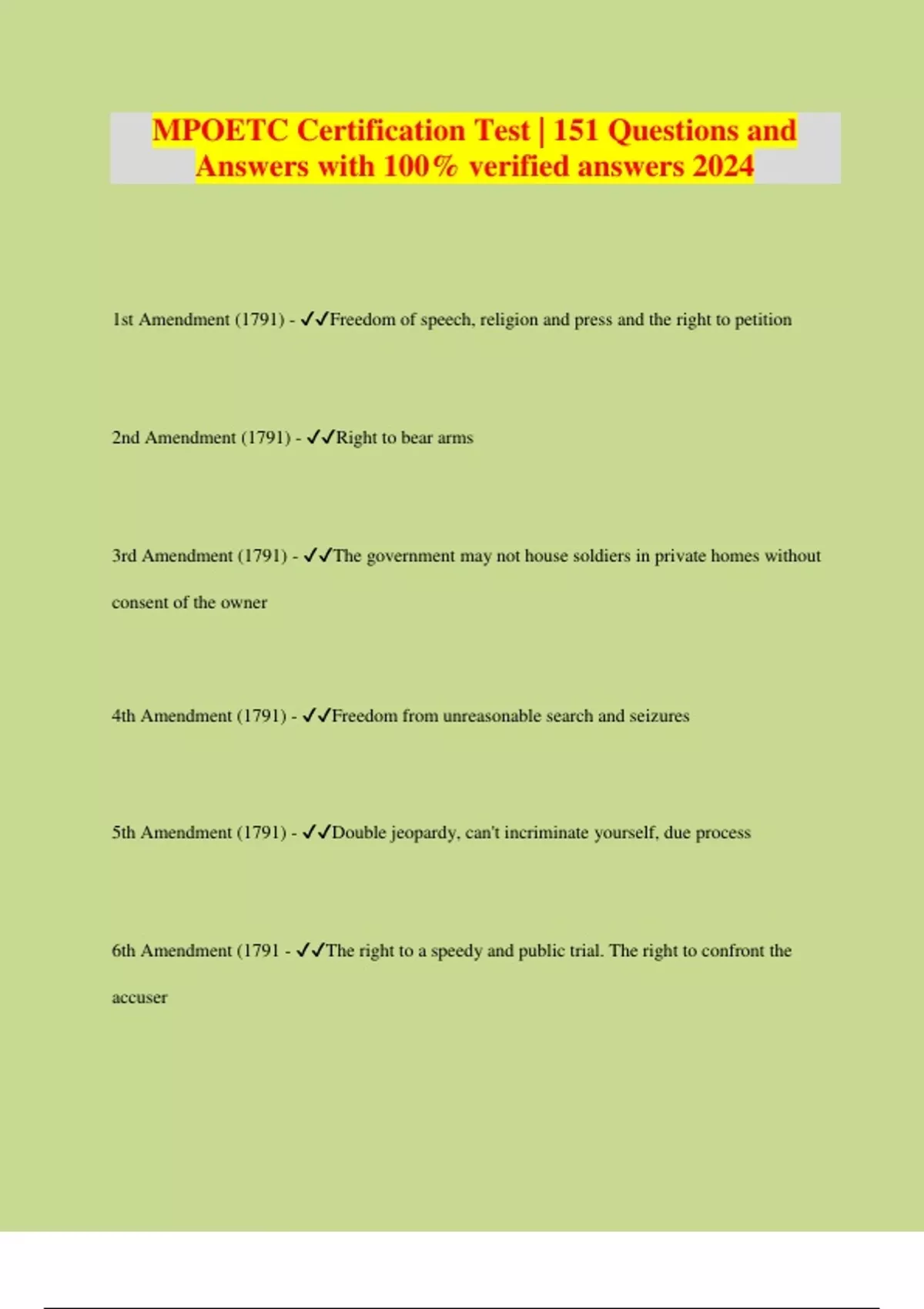 MPOETC Certification Test | 151 Questions and Answers with 100% verified answers 2024 1st Amendment (1791) - Freedom of speech, religion and press and the right to petition 2nd Amendment (1791) - Right to bear arms 3rd Amendment (1791) - The government may not house soldiers in private homes without consent of the owner 4th Amendment (1791) - Freedom from unreasonable search and seizures 5th Amendment (1791) - Double jeopardy, can't incriminate yourself, due process 6th Amendment (1791 - The right to a speedy and public trial. The right to confront the accuser 7th Amendment (1791) - Right to a trial by jury in civil cases 8th Amendment (1791) - Prohibits excessive fines and excessive bail/and cruel unusual punishment 14th Amendment - Can't deprive a citizen of life, liberty or property without due process Bill of Rights - First 10 amendments to the Constitution