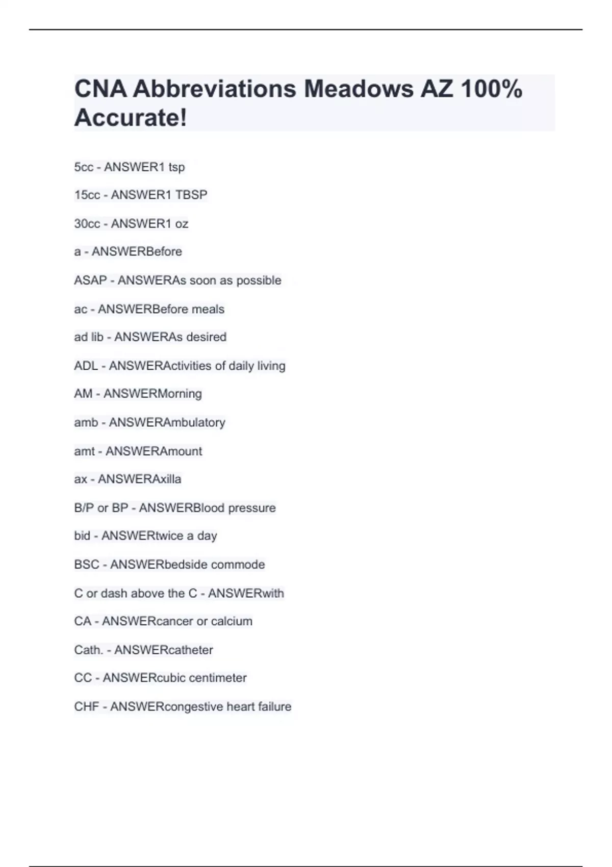 CNA Abbreviations Meadows AZ 100% Accurat5cc - ANSWER1 tsp 15cc - ANSWER1 TBSP 30cc - ANSWER1 oz a - ANSWERBefore ASAP - ANSWERAs soon as possible ac - ANSWERBefore meals ad lib - ANSWERAs desired ADL - ANSWERActivities of daily living AM - ANSWERMorning amb - ANSWERAmbulatory amt - ANSWERAmount ax - ANSWERAxilla B/P or BP - ANSWERBlood pressure bid - ANSWERtwice a day BSC - ANSWERbedside commode C or dash above the C - ANSWERwith CA - ANSWERcancer or calcium Cath. - ANSWERcatheter CC - ANSWERcubic centimeter e!